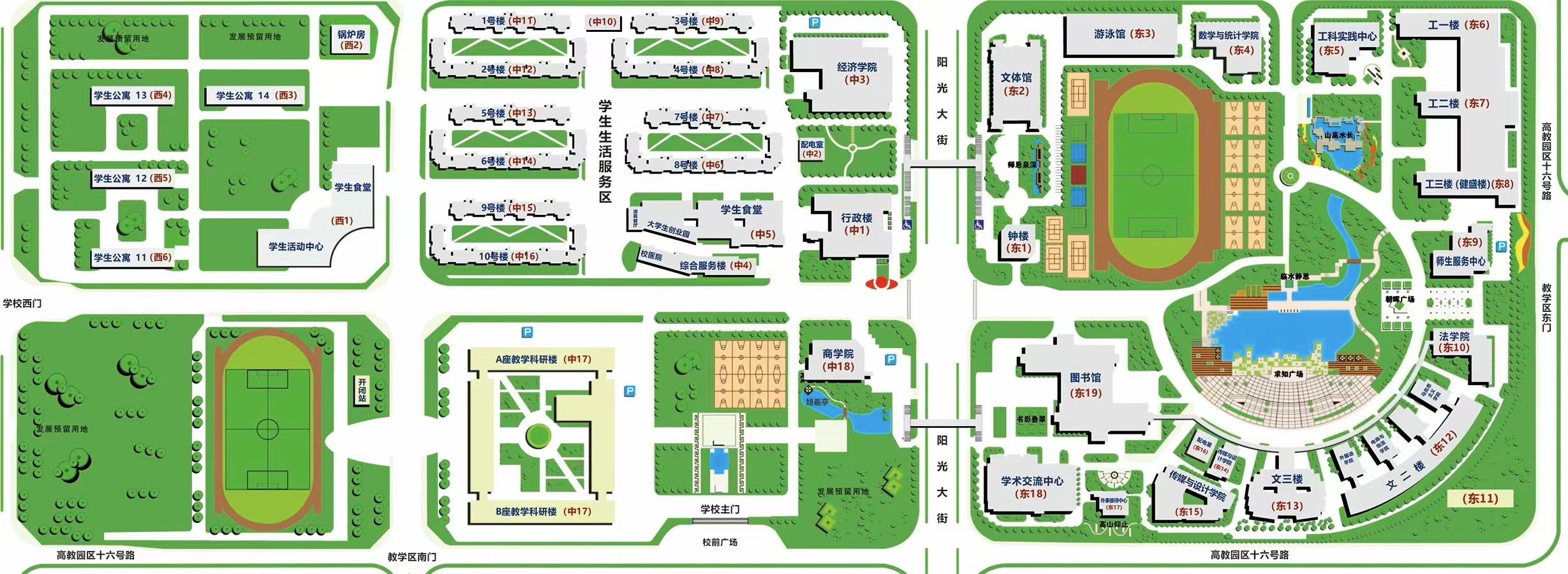 游泳馆(东3)、文体馆(东2)、图书馆(东19)、钟楼(东1)、配电室(东16、中2)、锅炉房(西2)因功能性强,保留原有名称,不做修改。