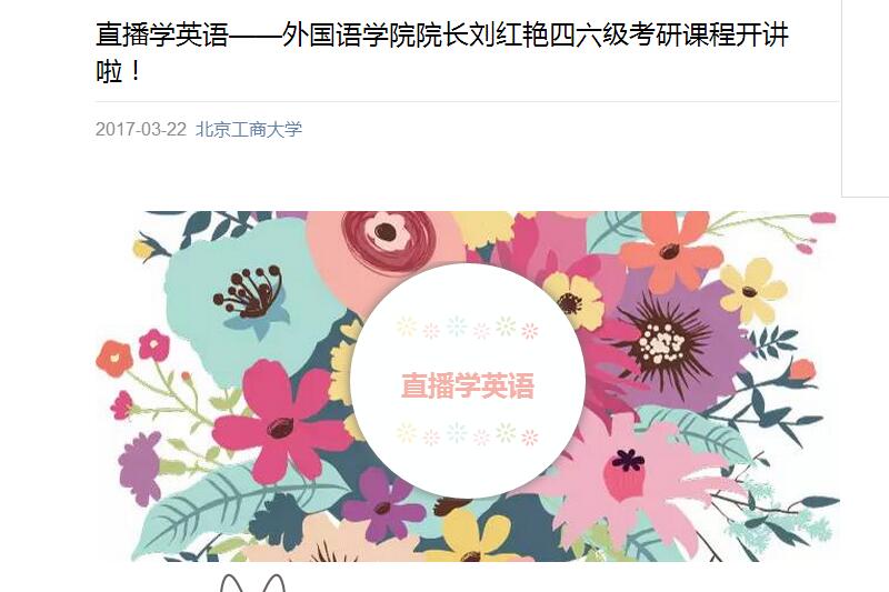 开学伊始,外国语学院和北京外国语大学网络学院签订了《四六级及考研英语系列在线课程》联合开发协议。322日晚7点到9点,外国语学院院长刘红艳教授受邀作客北外网院,给北工商学子奉献了精彩的讲座“考研英语决胜八大知识点”。讲座中深入研究考研英语大纲,透过现象看本质,破解四六级考研必考知识点。讲座精彩纷呈,刘院长以纯正的发音、缜密睿智的思维、风趣幽默的语言,为北工商学子奉上四六级考研英语葵花宝典。讲座以网络直播和手机APP直播双网并行,当天就有上万名学生选择用手机APP在线收看了直播。学生评价干货满满,收获满格。本次讲座得到教务处、宣传部的大力宣传和助推,尝试手机直播方式,学习人数创造了北工商讲座参与人数新高,在校园内掀起英语学习的热潮。