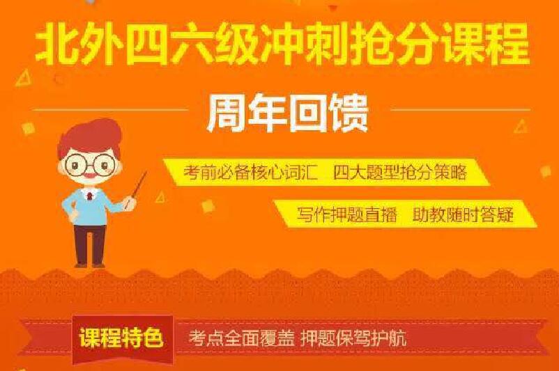 距离四六级考试12天之际,外国语学院再次奉上考前福利,经学院争取,北京外国语大学网络学院特为我校本次参加四六级考试的6220名考生免费开通了北外网院开发的四六级考前冲刺包课程,考点全面覆盖,共计200多课时。教务处和外国语学院对每一位考生进行统计,确保无一人遗漏,宣传部大力宣传,北京外国语大学用一周时间一一为考生建立账号,为我校学生创造最优条件,在考前做好最后的冲刺。有学生坦言,做北工商学生是幸福的,有学校强大的后盾,面对一样的四六级战场,拥有不一样的四六级体验。预祝北工商学子考出理想成绩,为学校争光。