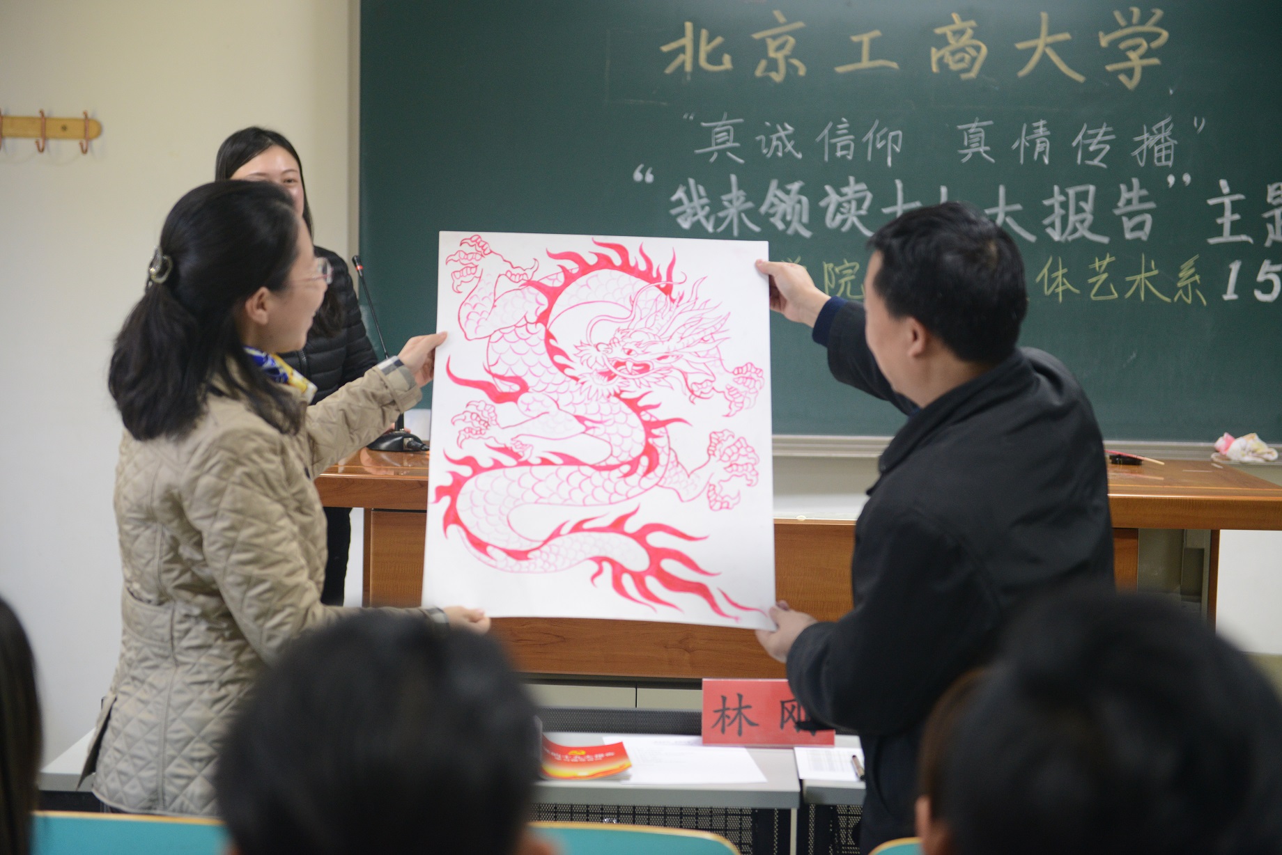 本次班会帮助同学们更加深入的理解和把握十九大精神,使同学们更加明确了在决胜小康以及全面建设社会主义现代化国家的新征程中,身为当代青年学子的历史使命与责任担当。班会过程中,张琦同学现场作画表达爱国之情,邀请老师们为“中国龙”进行点睛,一幅栩栩如生的“中国龙”跃然纸上,深得老师和同学们赞叹。