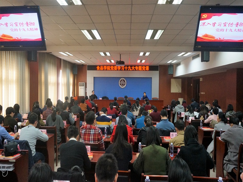 11月8日下午,食品学院党委邀请马克思主义学院吴穹老师为全体教工党员和部分学生党员讲党课,带领党员认真研读十九大报告各部分内容,学习习近平新时代中国特色社会主义思想。会议由学院党委书记何猛主持。