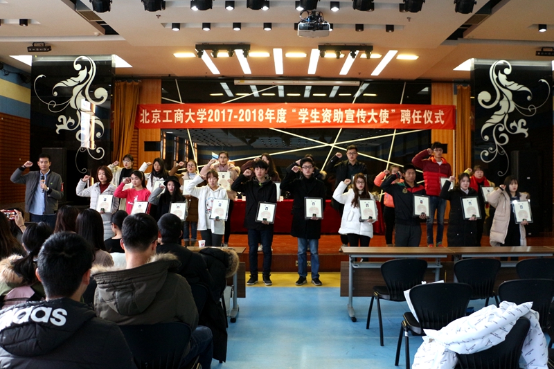 仪式在雄壮的国歌声中拉开帷幕。吕素香处长首先宣读了《关于聘任北京工商大学2018年度“学生资助宣传大使”的决定》,并和张梅副主任共同为20名新聘任的“学生资助宣传大使”颁发聘书及徽章。20名资助大使在全场老师和同学面前庄严宣誓:要做励志成才的先行者、资助政策的学习者、资助政策的传播者和知恩、感恩的践行者。随后,学生资助中心副主任张倩老师对“学生资助宣传大使”的工作要点进行了说明;计算机与信息工程学院刘畅同学分享了被聘任为学校首批“学生资助宣传大使”的喜悦和感悟;理学院国家奖学金获得者郭实秋、经济学院国家励志奖学金获得者李雪儿进行了资助宣传模拟宣讲。她们结合自身成长经历,讲述了如何在国家资助政策的帮扶下刻苦学习,从自卑走向自强,最终获得国家级奖学金的心路历程,赢得了现场观众热烈的掌声。
