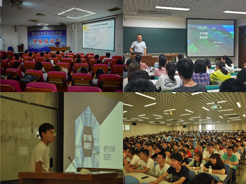 院长于重重教授首先向新生介绍学院整体情况,教导新生如何迈出大学第一步。副院长廉小亲教授就教学管理进行说明,如取得学士学位绩点要求、奖学金获得和保研条件、专业分流相关信息、“三六九”目标及相关竞赛等。党委副书记杨立功老师介绍学生管理工作,内容涉及学生工作队伍、学生管理工作、大学生活可能遇到的困境以及违纪处分管理规定等方面,细致详尽。党委书记蔡强教授对新同学表示热烈欢迎,强调同学们需要明确自身目标,期望在大学成为什么样的人、未来希望走怎样的路等等,并代表学院表示对新生努力学习的大力支持。辅导员老师向同学们明确了大学生活中的重要事项,良好的大学生活环境是学习的基础,也希望同学们遵守校园安全等各项规定要求,度过难忘的大学生活。