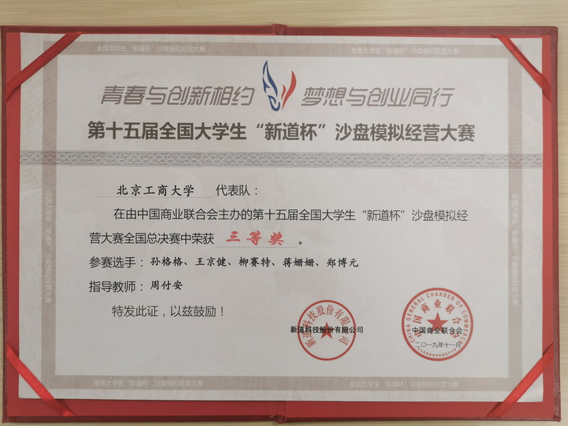 11月15日至17日,由中国商业联合会主办,金陵科技学院承办,新道科技有限公司提供技术支持的“第十五届新道杯全国大学生企业模拟经营大赛(本科组)总决赛”在南京金陵科技学院举行。来自全国30个省市自治区100多所高校的120支队伍参加比赛。由我校经济学院文科实践中心组织,周付安、田芬老师指导的参赛代表队荣获了三等奖。