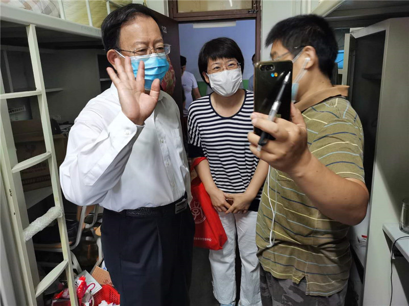 7月2日上午,校长孙宝国、副校长方德英深入学生宿舍,看望慰问正在为毕业生整理寄送行李的教职员工,并与在线的学生视频送上远程问候。学校办公室副主任孙磊,经济学院党委书记吕素香、副书记杜亚辉,公共事务处副处长陶伟陪同慰问。