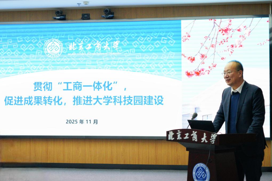 钱立军代表科管办以“贯彻工商一体化,促进成果转化,推进大学科技园建设”为主题进行汇报,详细介绍了大学科技园建设的整体框架、建设思路、企业入孵程序等工作。他强调,大学科技园是链接创新与产业的关键桥梁,更是学校服务国家战略和区域经济发展的重要平台,学校将以此为驱动,有力推动科技成果转化,不断激发学科建设与科技创新活力,为国家科技发展、实现高水平科技自立自强贡献北工商力量。