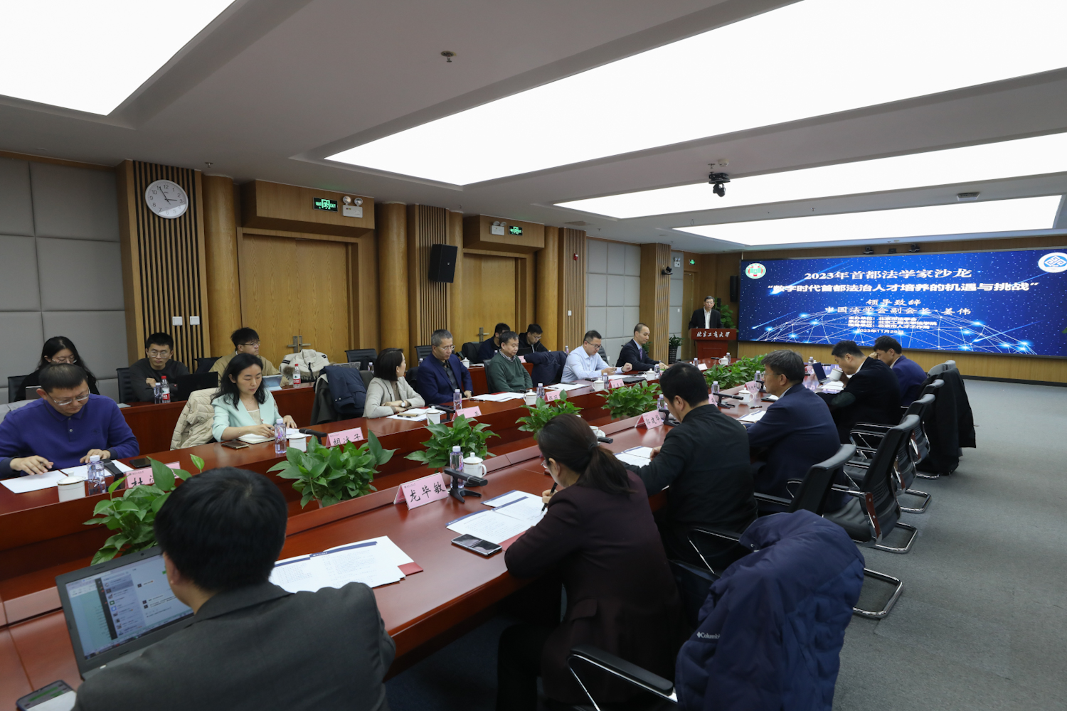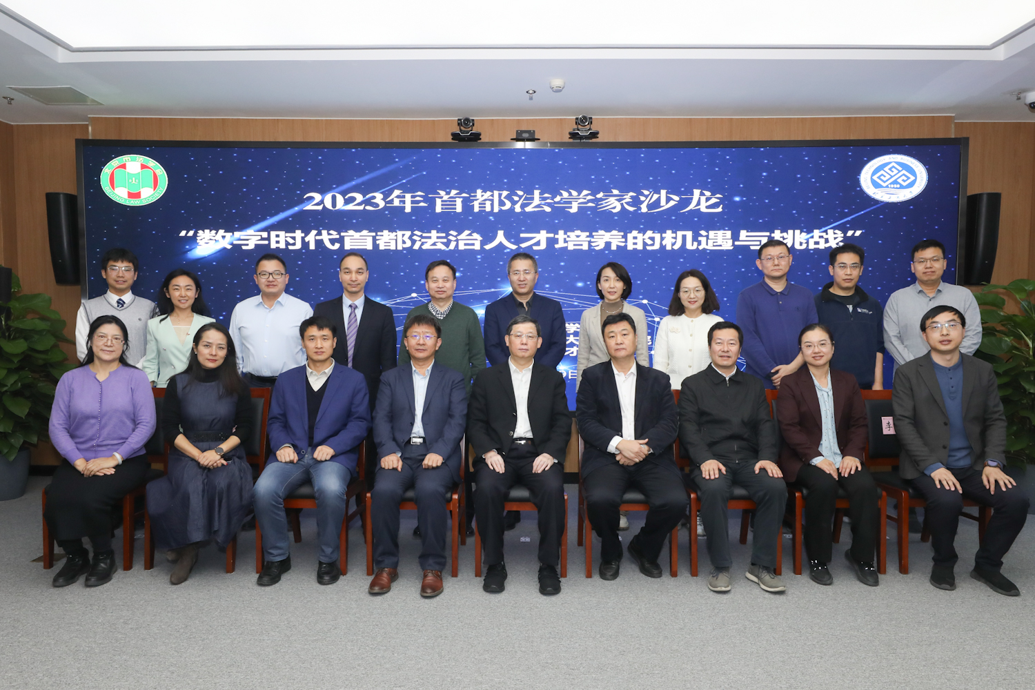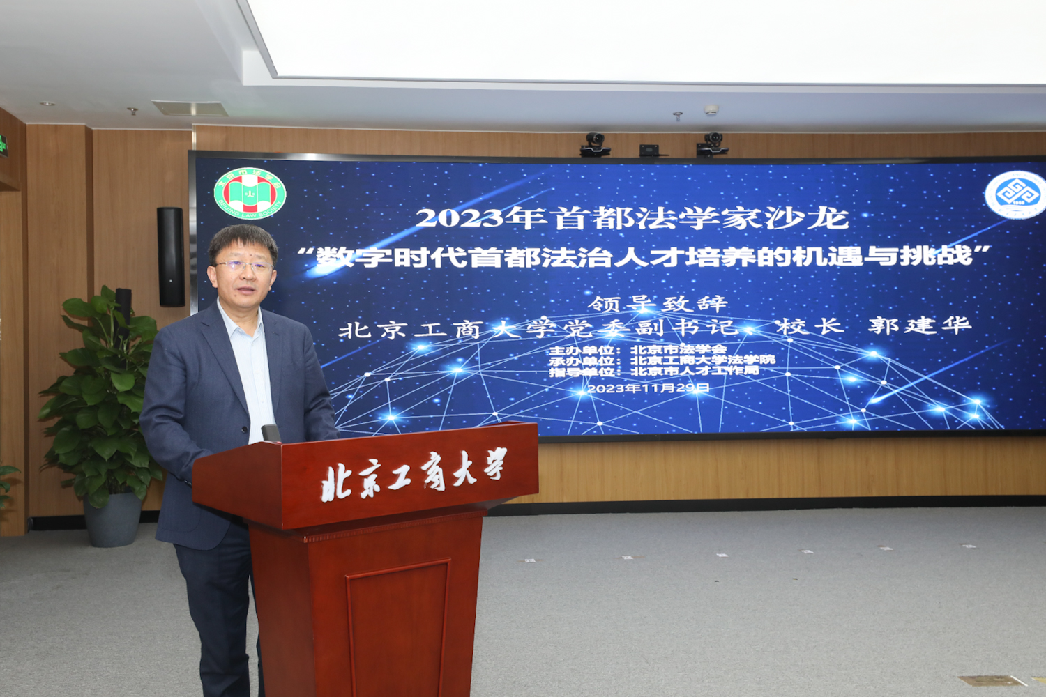 为响应数字中国和法治国家建设号召,11月29日,由北京市法学会主办,我校承办的“2023年首都法学家沙龙——数字时代首都法治人才培养的机遇与挑战研讨会”在阜成路校区举行。中国法学会副会长姜伟,北京市法学会党组书记、专职副会长郭旭升,北京市人才工作局人才高地建设处处长龙毕敏,学校党委副书记、校长郭建华,学校党委常委、副校长刘敏华出席会议。会议由学校法学院院长陈敦主持。