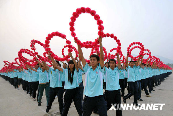 如果你订阅了手机报,一定对今早头版的一张照片印象深刻:湖水蓝的T恤、杜鹃粉的花环、整齐划一的动作,不错,照片记录的正是我校国庆方队成员在密云合练时的精彩瞬间。