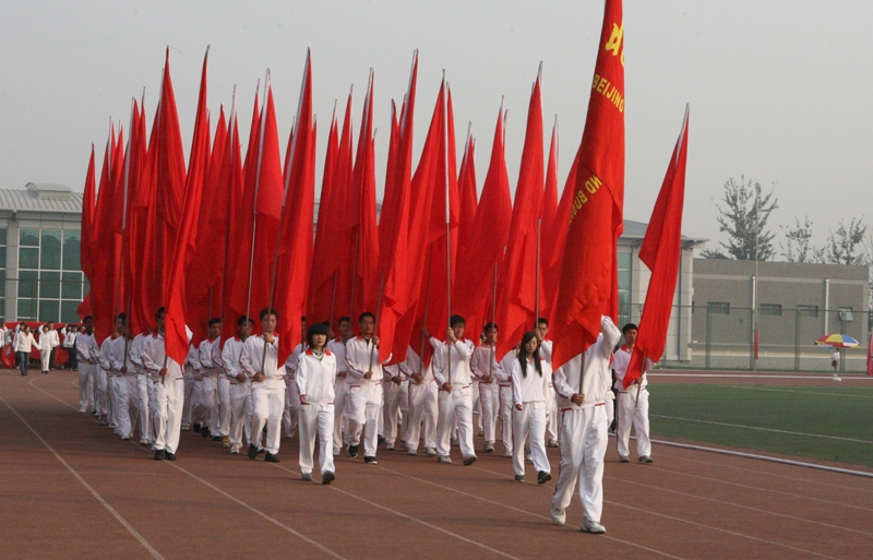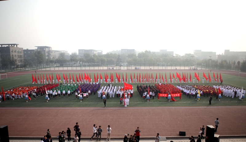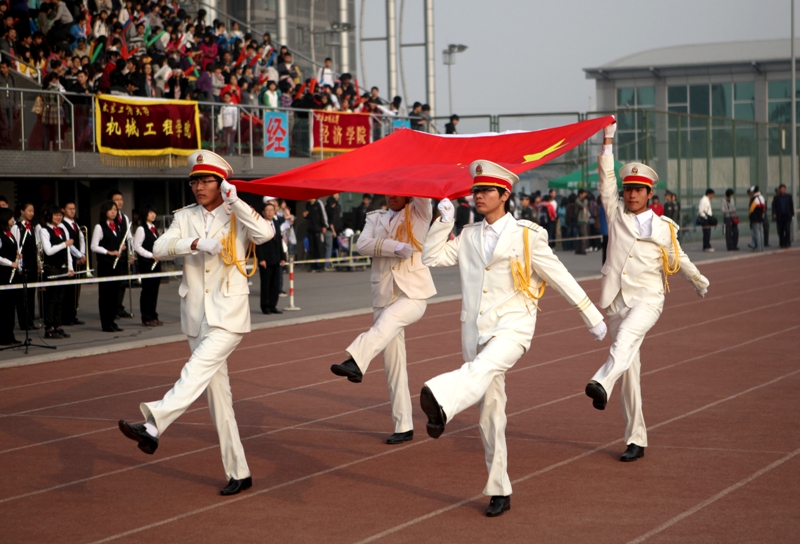 8点30分,李朝鲜副校长宣布:“运动会开幕!”我校四名同学高擎五星红旗,在激昂的乐曲声中踏入会场。紧随其后的红旗方阵在阳光的映衬下也格外引人注目。由我校9个学院、研究生部以及嘉华学院组成的11个方阵依次在主席台前展现了他们的风采,特别是每个学院一分钟表演成为开幕式的最大亮点。看台上,各学院的观众也花样频出,各具特色,大鼓、喇叭、飘带、腰鼓纷纷登场“亮相”。同学们为运动员加油的同时,也展现了良好的精神风貌。