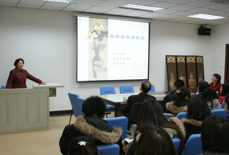 汪苹教授不仅以一名教授,一名政协委员,而更是以一名普通群众代表的身份,近距离、深切的向同学们介绍了一下自己作为两届政协委员所走过的心路历程,介绍了作为一名代表如何代表群众向国家表达意见和建议,汪苹教授还风趣的向参会的师生代表“晒”了自己几年来的代表提案。现场同学纷纷就自己感兴趣的话题向汪苹教授请教。