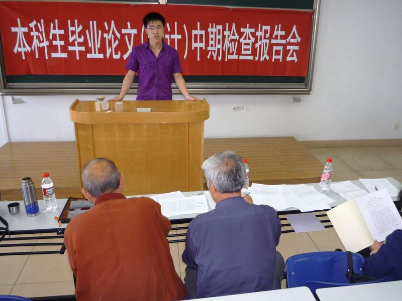 报告会分5个组同时进行,14位校内外督导专家参加了检查。本次报告会的主要内容是对本科生毕业论文(设计)的选题质量、开题报告情况、阶段性进展情况、学生工作态度、指导教师指导情况、周志记载情况、前期工作质量等工作进行具体检查。