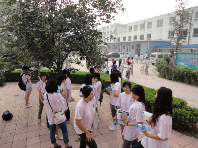 【艺术与传媒学院实践分团供稿】7月22日早上,艺术与传媒学院实践分团的成员们很早便起床洗漱,准备开始一天的实践活动。上午7:45,已经有二十个左右良乡四中的学生来到了学校,他们有的穿白短袖灰长裤的校服,有的穿着便装,他们围着学校的金属雕塑嬉笑追逐打闹,时不时好奇地看看多功能厅前统一着粉色T恤的支教学生,彼此窃窃私语。这一边的支教学生同时也在观察这些他们未来的学生,有所思忖。