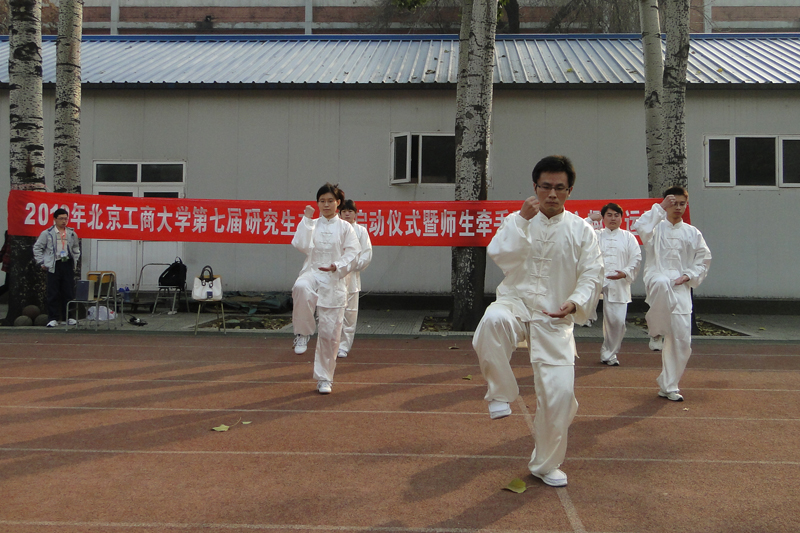 随后以“师生牵手、共建和谐”为主题的趣味运动会掀起了活动的高潮。首先,太极拳协会的同学表演了精彩的陈氏太极拳,流程、自信的表演获得了在场同学的热烈欢迎。接下来障碍接力跑、定点投篮、单人跳绳、折返接力跑和盲人方阵五个集体项目,更是让参与的同学兴奋不已。研究生部老师也与同学们一起参加了定点投篮、折返接力跑和盲人方阵三个项目。老师们的参与,使趣味运动会高潮迭起。最终第9代表队(研10法学班)、第4代表队(研10会计二班)、第16代表队(研10机械、材料班)分获团体第一、二、三名。
