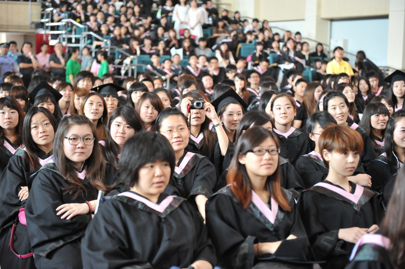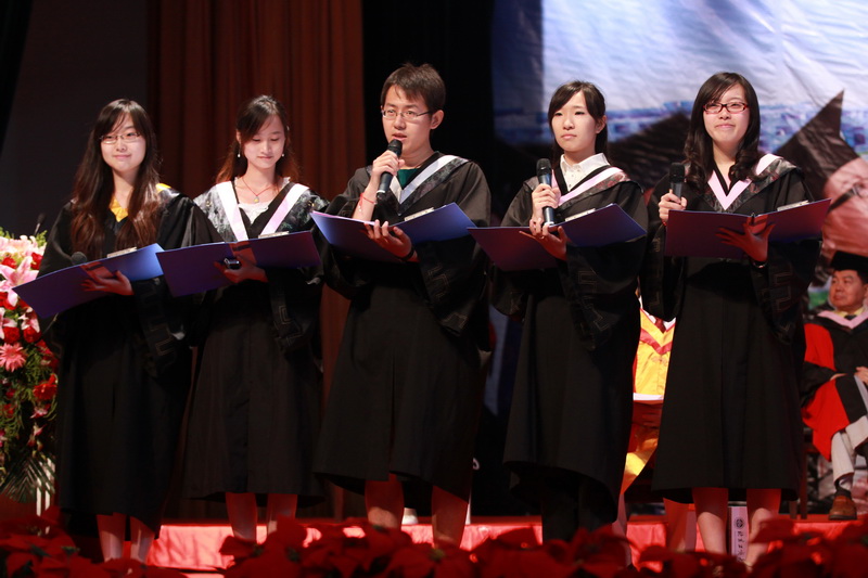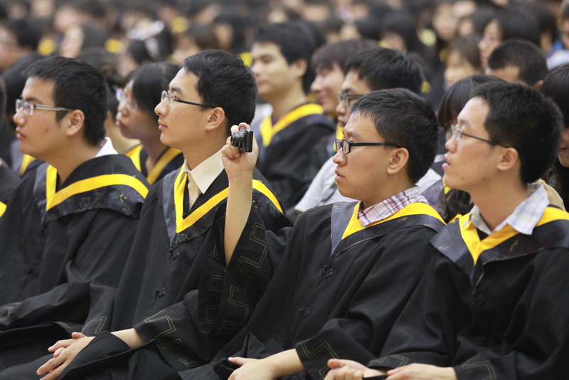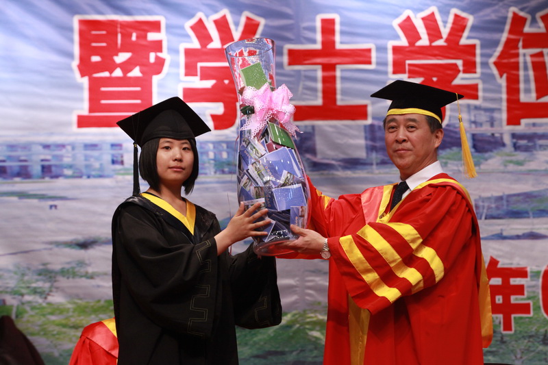 学士学位授予仪式在一片欢呼声中开始,全体2011届本科毕业生依次上台,满怀激动的心情,领取毕业证书,接受领导拨正流苏,并与校领导合影留念。毕业生们一同将学士帽高高抛向空中,对母校的祝福声久久回荡在文体馆上空……