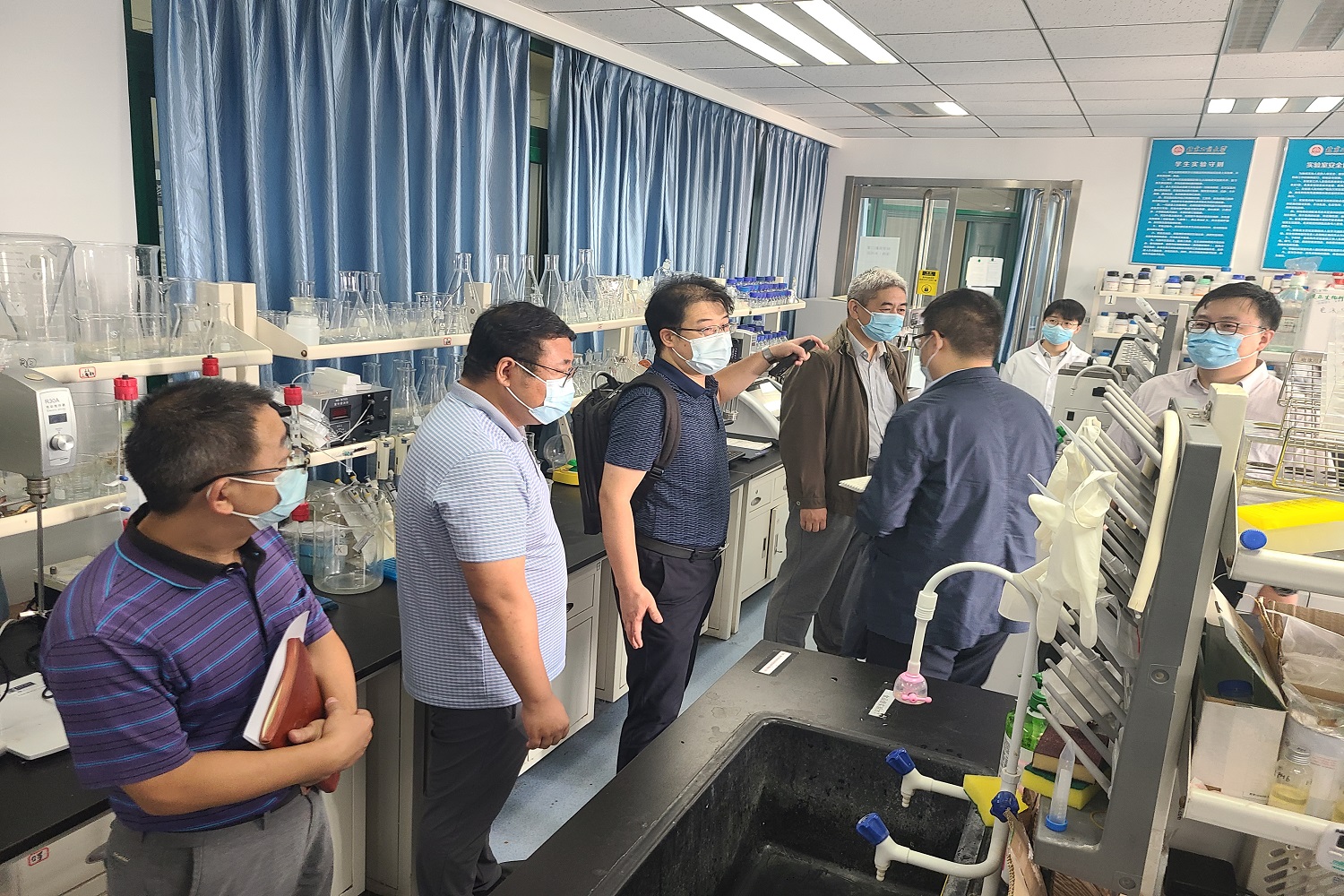 专家组一行深入食品与健康学院、轻工科学技术学院、化学与材料工程学院、易制爆危险化学品储存室及危险废物暂存场所,对学校实验室安全管理及疫情防控要求落实情况开展详细检查。期间,专家组逐一询问实验室负责人、安全管理人员对安全管理制度和工作措施的落实情况,查看实验场所、消防设施、水电安全、危险化学品管理、台账记录等,并现场指出存在的安全隐患。