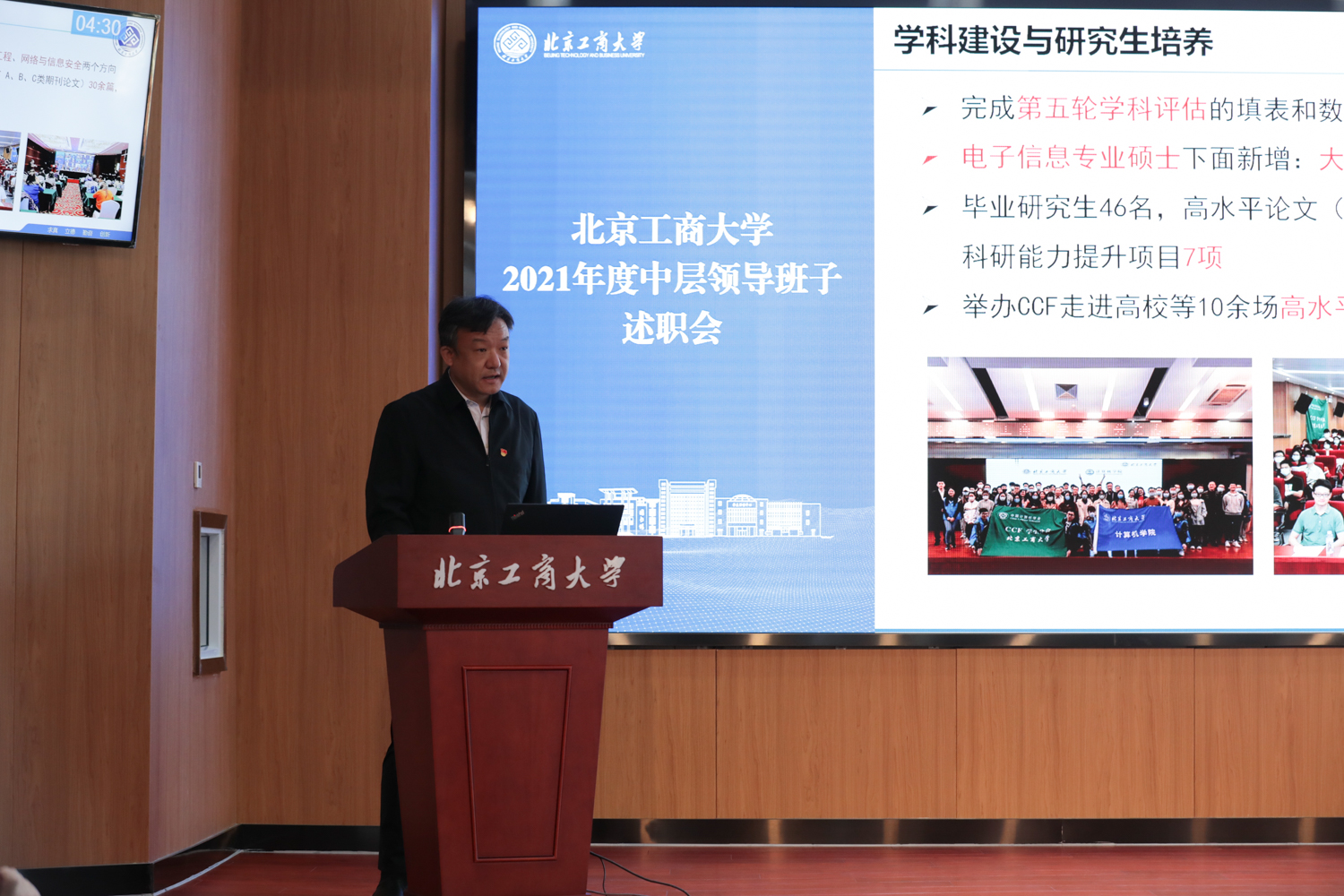 根据学校中层领导班子、中层干部考核工作安排,由各二级单位行政负责人依次代表领导班子对年度工作进行述职。43家二级单位负责人根据本单位自身职责定位,围绕学校党政工作要点、十大重点工作任务等内容,涵盖党的建设、班子自身建设、党风廉政及作风建设等方面情况,以文稿演示形式汇报了2021年工作完成情况、存在问题,展示了取得的工作业绩,并对2022年重点工作进行展望。