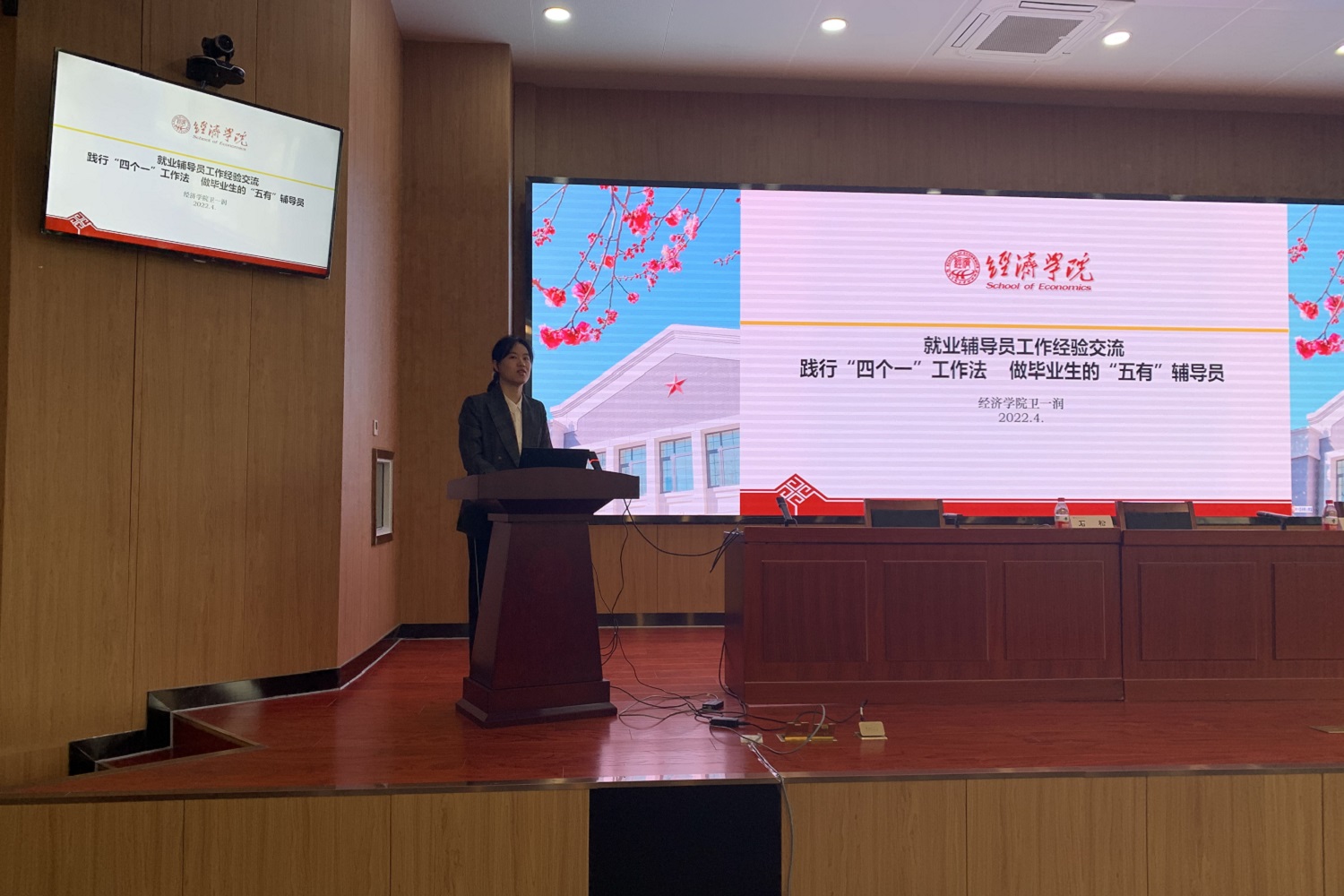 经济学院副院长宁威、计算机学院副院长谭励、人工智能学院本科教学秘书丁军飚作为2021年本科招生工作先进单位代表分别针对本学院本科招生工作典型做法进行经验分享。轻工科学技术学院党委副书记熊慧、经济学院就业辅导员卫一润作为2021年就业创业工作先进代表分别就本学院就业理念、队伍协同、特色工作进行经验分享。