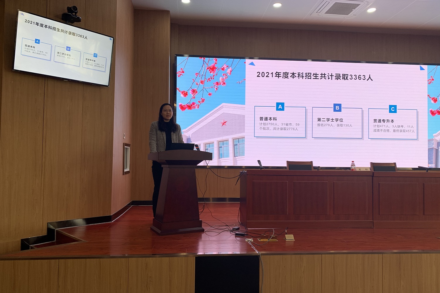 招生就业处处长杨林介绍了召开此次会议的背景和目的,并对各学院落实有关会议精神提出建议。招生就业处副处长石松从就业工作面临形势、2021届毕业生就业情况、2022届毕业生基本情况及就业进展情况、针对不同就业群体的工作思路和重点工作推进六个方面对就业工作进行部署。本科招生负责人卜晓媛从本科招生基本情况、存在问题、推进工作和工作日程四个方面对本科招生工作进行介绍。