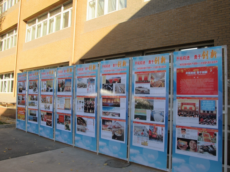 为迎接中国共产党第十八次全国代表大会召开,10月31日,宣传部在阜成路、良乡两校区分别展出了主题为“科学发展 成就辉煌”、“开拓前进 勇于创新”和“同心同德 开拓进取”的宣传展板。