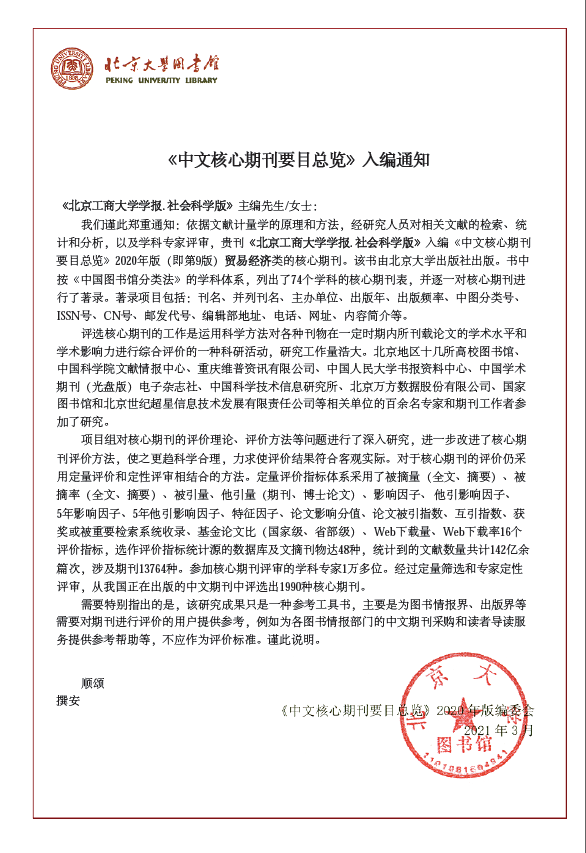 近日,南京大学中国社会科学研究评价中心(CSSCI)发布了最新的CSSCI来源期刊目录(2021—2022),《北京工商大学学报(社会科学版)》再次入选CSSCI来源期刊,这也是学报自2006年以来连续第8次入选CSSCI来源期刊目录。本年度,学报还入编北京大学《中文核心期刊要目总览》2020年版(即第9版)贸易经济类的核心期刊,并入选中国人民大学“复印报刊资料重要转载来源期刊(2020年版)”。