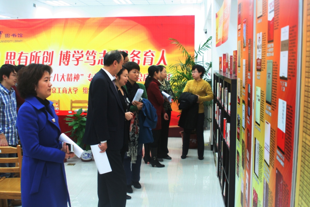 为认真贯彻落实“十八大”会议精神、热情讴歌党的光辉业绩、加快推进学习型基层党组织建设、引导师生多读书、读好书, 11月20日下午,图书馆在阜成路校区举行了以“读有所思、思有所创、博学笃志服务育人”为主题的“学习十八大精神”专题书展暨读书会启动仪式。学校党委副书记卢思锋、组织部部长兼机关党委常务副书记董竹娟、宣传部部长张春萍、学生处处长吕素香、组织部副部长兼机关党委副书记郑喜姣、图书馆全体共产党员及学生代表参加了启动仪式。仪式由图书馆党支部书记李艳芬主持。