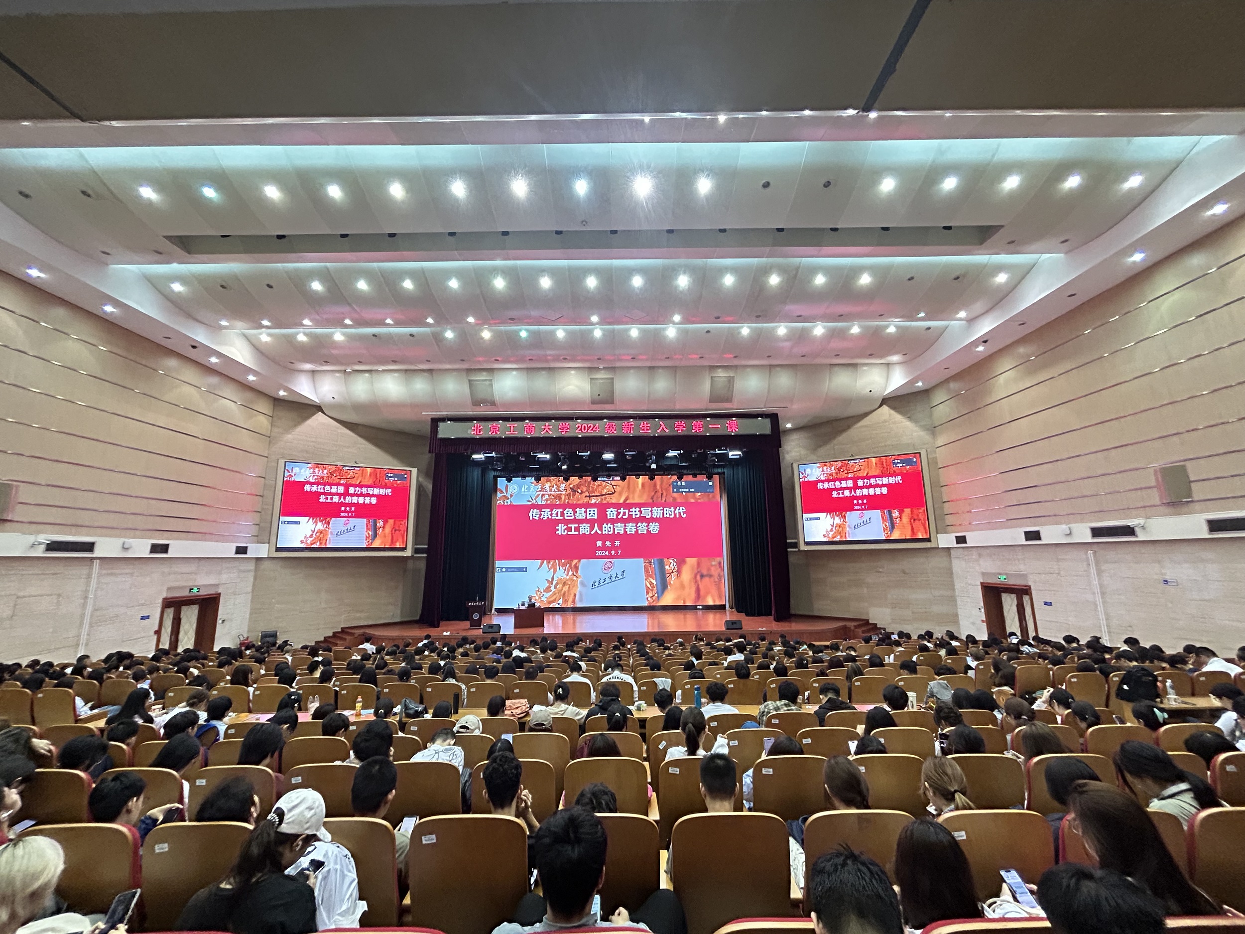 学校党委书记黄先开以“传承红色基因,奋力书写新时代,北工商人的青春答卷”为题为全体2024级新生讲授“开学第一课”。