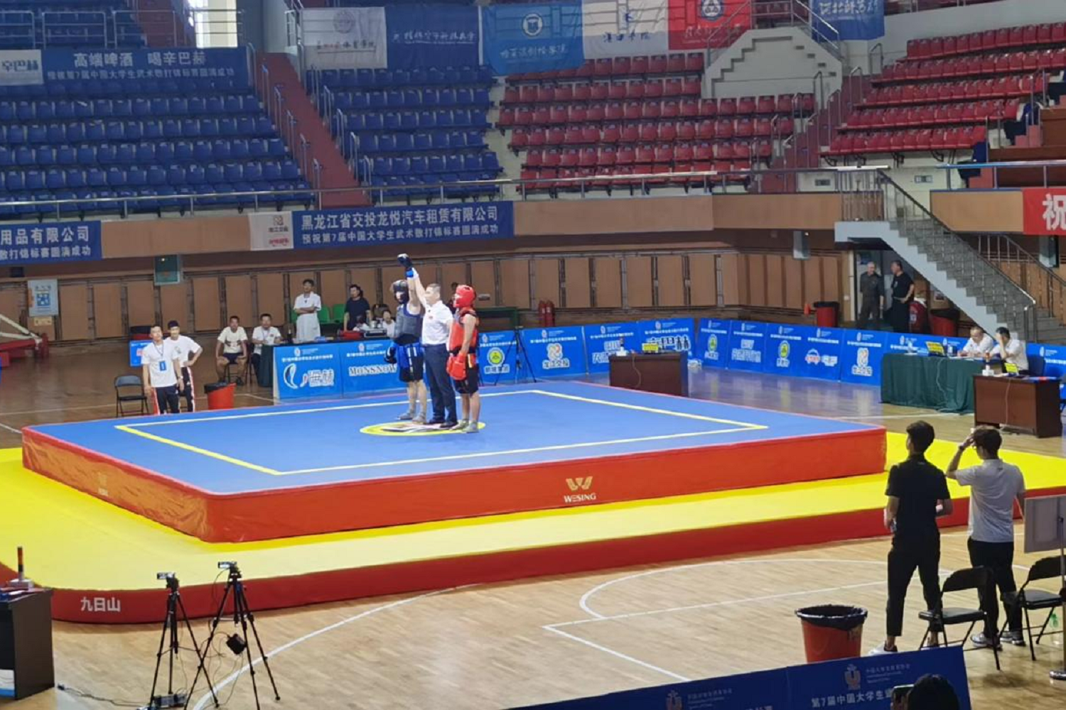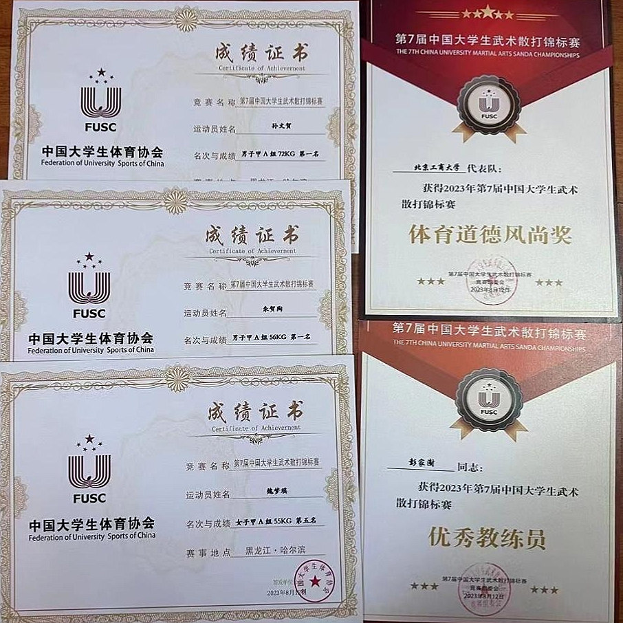 近日,第7届中国大学生武术散打锦标赛在哈尔滨举行。北京工商大学散打队以优异的成绩崭露头角,本次赛事我校散打队共三人参赛,队员孙文贺取得男子甲组72kg级冠军、队员朱贺陶取得男子甲组56kg级冠军、队员魏梦瑶取得女子甲组55kg第五名,并荣获“体育道德风尚奖”运动员称号;北京工商大学散打队获中国第7届大学生武术散打锦标赛体育道德风尚奖,散打队教练彭家澍老师获“优秀教练员”称号。