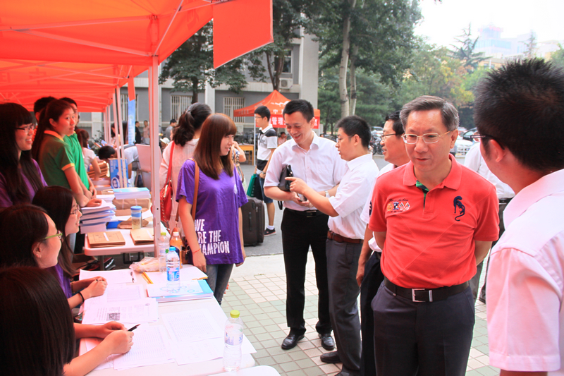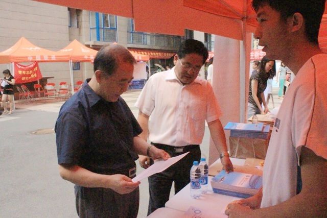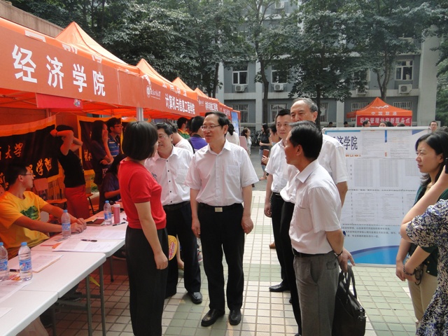 校党委书记孙尧东、校长谭向勇、校党委副书记卢思锋、党委副书记兼纪委书记张德玉、副校长谢志华、张耘等先后来到迎新现场,在各学院接待处与负责接待工作的学院领导、研究生辅导员、学生干部和志愿者们亲切交流,向他们了解迎新工作的进展情况。在得知商学院、计信学院都安排有新生班级临时负责人参与接待工作,校领导十分高兴,关切地询问几位新生负责人“本科在哪所学校就读”、“生源地是哪里”、“对学校安排是否满意”等。