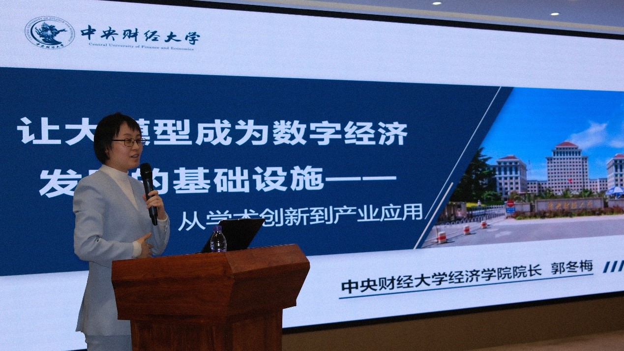 中央财经大学经济学院院长郭冬梅教授围绕“数字经济学科建设与大模型研发”进行了分享。她指出,中央财大数字经济学科自2020年启动建设以来,已形成从本科到研究生的完整培养体系,建设数字经济实验室,并积极推动产教深度融合。团队自主研发的区域与产业发展大模型,已具备长文本生成、智能问答、产业协同分析等功能。未来,该模型将进一步拓展至经济运行监测、政策评估与智能决策支持等领域,构建多层次的经济逻辑分析框架,助力经济学研究从经验分析迈向智能决策。