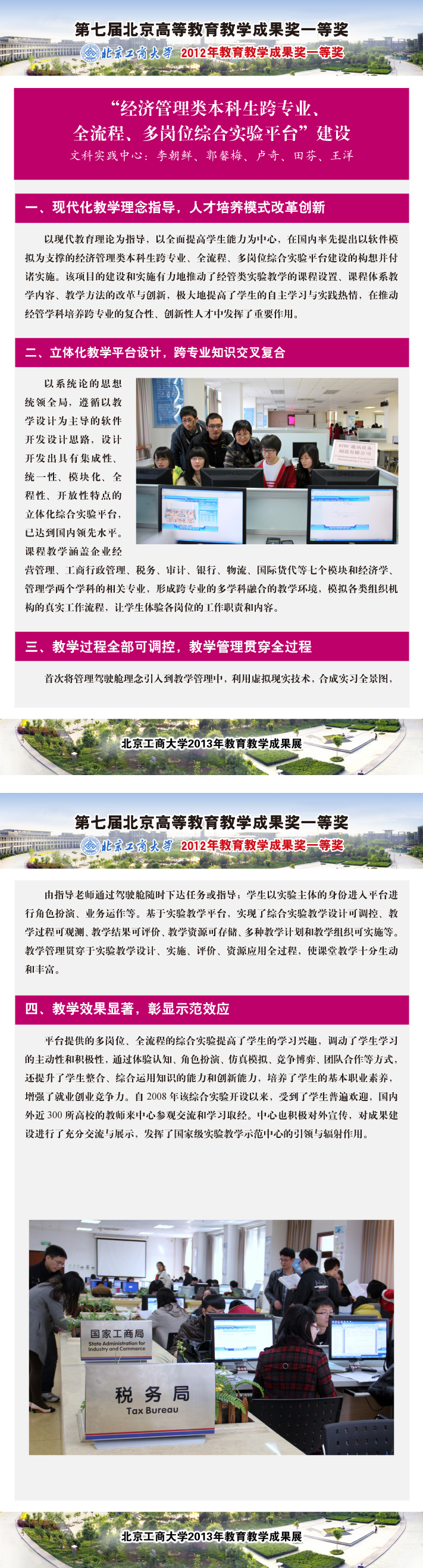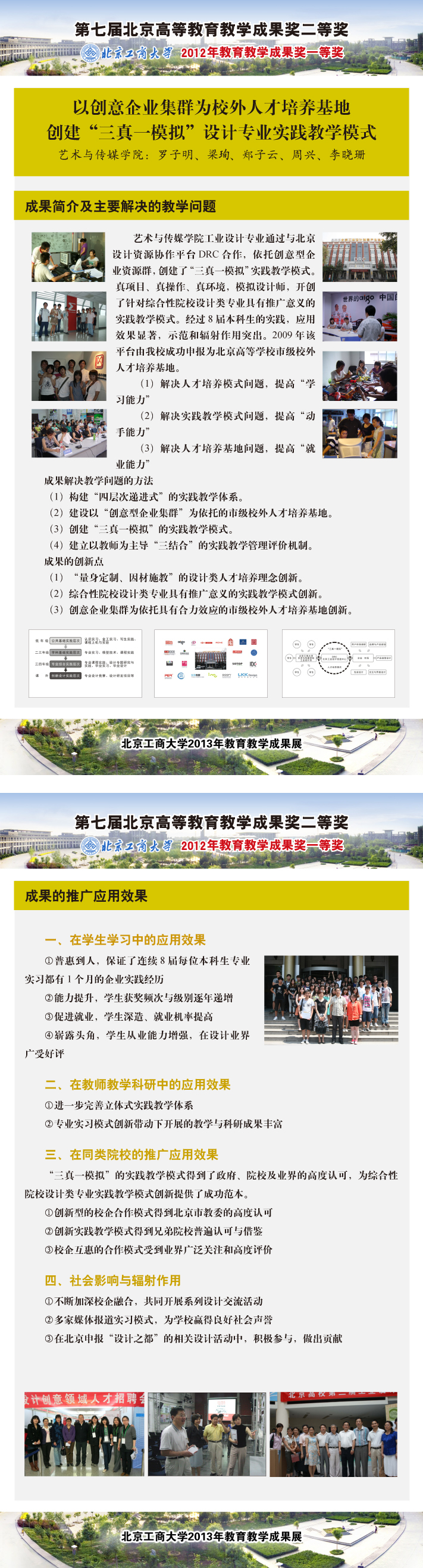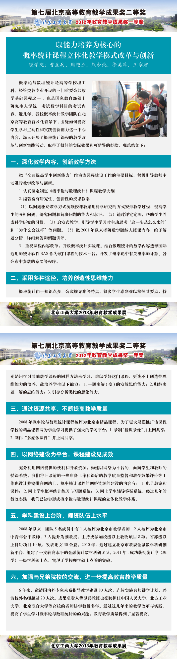 日前,《北京市教育委员会、北京市人力资源和社会保障局、北京市财政局关于表彰北京市教育教学成果奖的决定》(京教人〔2013〕18号)发布。在第七届北京市高等教育教学成果奖评选活动中,我校共有5项成果荣获一等奖、9项成果荣获二等奖。根据北京市教委有关文件精神,为了更好地展示和宣传我校教育教学和人才培养成果,总结本科教育教学经验,营造良好的教学工作氛围,学校举办2013年教育教学成果展,现进行网上展示。