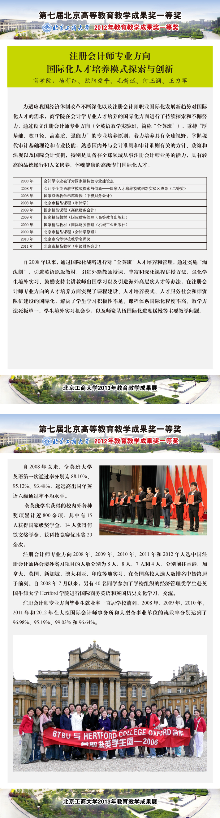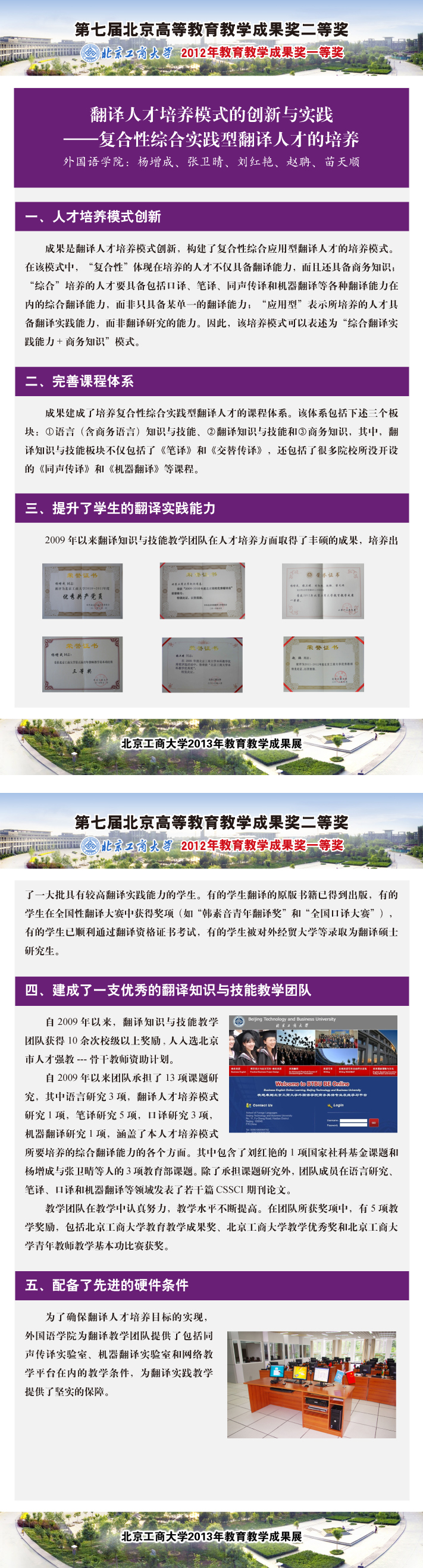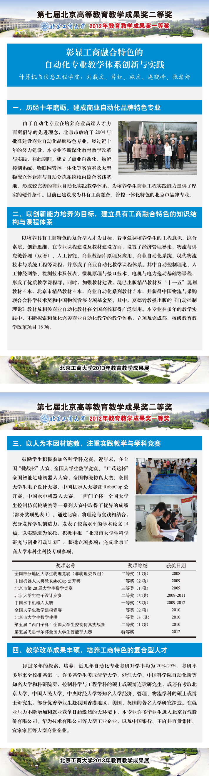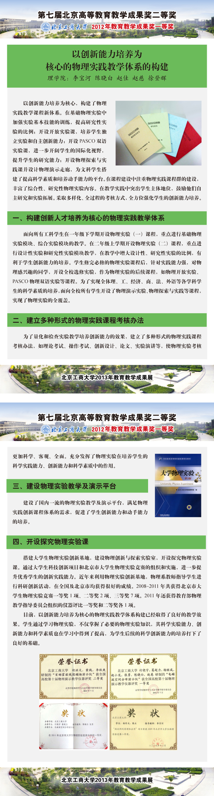 日前,《北京市教育委员会、北京市人力资源和社会保障局、北京市财政局关于表彰北京市教育教学成果奖的决定》(京教人〔2013〕18号)发布。在第七届北京市高等教育教学成果奖评选活动中,我校共有5项成果荣获一等奖、9项成果荣获二等奖。根据北京市教委有关文件精神,为了更好地展示和宣传我校教育教学和人才培养成果,总结本科教育教学经验,营造良好的教学工作氛围,学校举办2013年教育教学成果展,现进行网上展示。