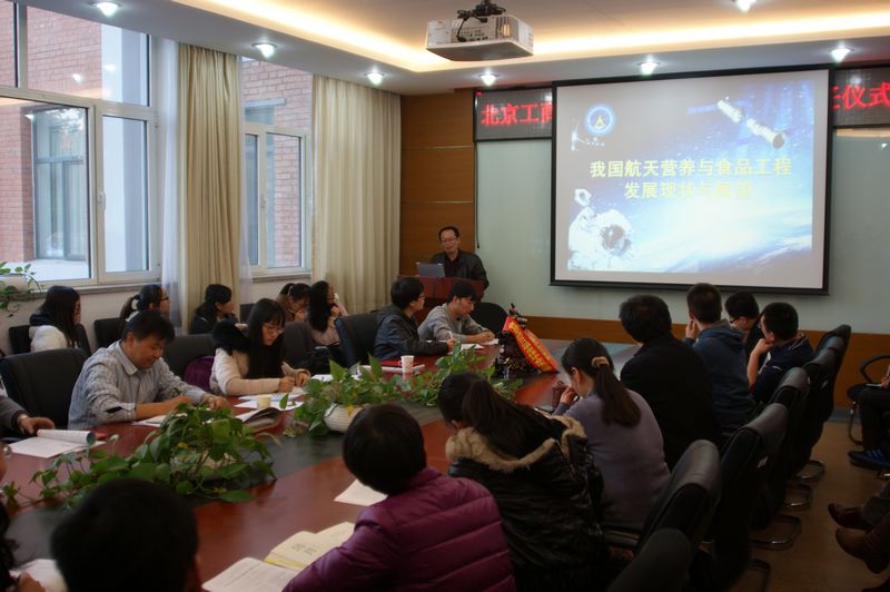 受聘仪式后,陈斌研究员为与会师生作了题为“我国航天营养与食品工程发展现状与展望”的学术报告。他就航天食品的研究、国外航天食品与营养发展及我国航天食品与营养工程的发展情况与未来发展趋势等方面做了生动精彩的报告。报告中关于中式食品的航天化研究,中国特色的航天营养保障体系等内容吸引了在场的每一个人,原定一个半小时的学术讲座持续了两个多小时。最后报告在全场师生热烈的掌声中结束。