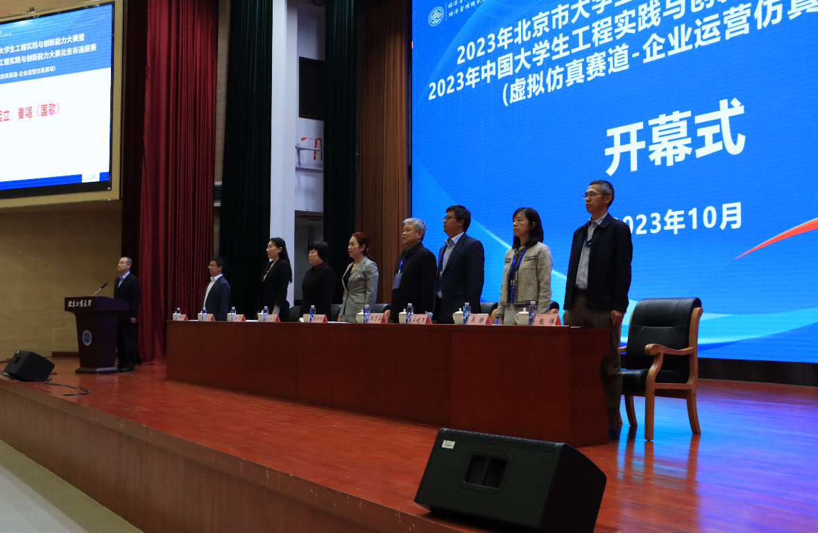 全体人员在庄严的国歌声中起立,正式拉开了2023年中国工创大赛北京市选拔赛企业运营仿真赛项开幕式的序幕。北京工商大学党委常委、副校长徐丹丹作为学校代表致欢迎词,对参加此次大赛的市教委领导、嘉宾、老师和同学们表示热烈的欢迎,并表示此次大赛的主旨是交叉融合工程创新求卓越,与我校高度重视学科交叉融合和建设高水平研究型大学的目标不谋而合,希望通过这次赛事同各院校互相学习,进一步助力学校的高质量发展。