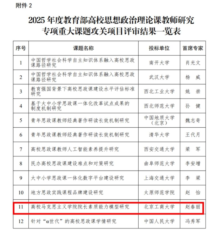 近日,教育部社科司公布2025年度高校思想政治理论课教师研究专项重大课题攻关项目评审结果,我校教师赵春丽教授牵头申报的《高校马克思主义学院院长素质能力模型研究》成功获批,实现了学校在该类重大课题攻关项目上的历史性突破。