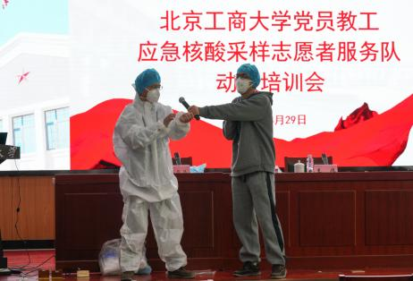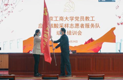 4月29日上午,学校以线下线上相结合的方式,举行党员教工应急核酸采样志愿服务队动员培训会。学校党委副书记王伟出席会议,并为志愿服务队授旗。他肯定了党员教工“抗疫有我、冲锋在前”的精神品格,强调要坚持党建引领,贯彻落实上级各项工作部署,认真参与培训、掌握专业要求,在组织召唤时,第一时间进入战斗状态,协力织密校园疫情防控网,用硬核能力打赢抗疫硬仗。会上,在校医院医护工作人员指导下,对志愿者开展了专业培训,使大家能够较快地掌握防护服穿脱、信息录入、秩序维护等工作内容。