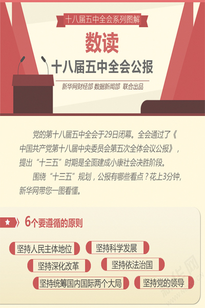党的第十八届五中全会于10月29日胜利闭幕。全会听取和讨论了习近平总书记受中央政治局委托作的工作报告,审议通过了《中共中央关于制定国民经济和社会发展第十三个五年规划的建议》。全会通过的《中国共产党第十八届中央委员会第五次全体会议公报》,描绘了未来五年的发展蓝图。“十三五”时期是全面建成小康社会决胜阶段,新华网10月29日发表文章,对《会议公报》进行解读,现将文章转载如下: