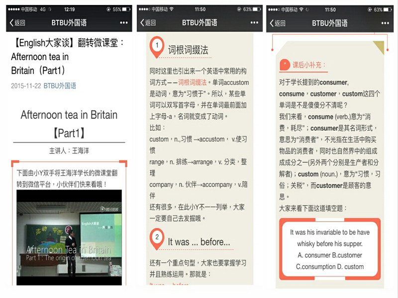 另外,学院以专业教师、外籍教师为指导教师,对精“英”小导师进行精心指导,进行微课专业设计。同时,组成“翻转微课堂”团队,对微课进行实时录像,制作“翻转微课堂”教学视频,总结课堂知识要点,拓展语言文化内容,定期发布学院官方微信,保证线上线下不断线,温故知新,形成闭环学习效果。