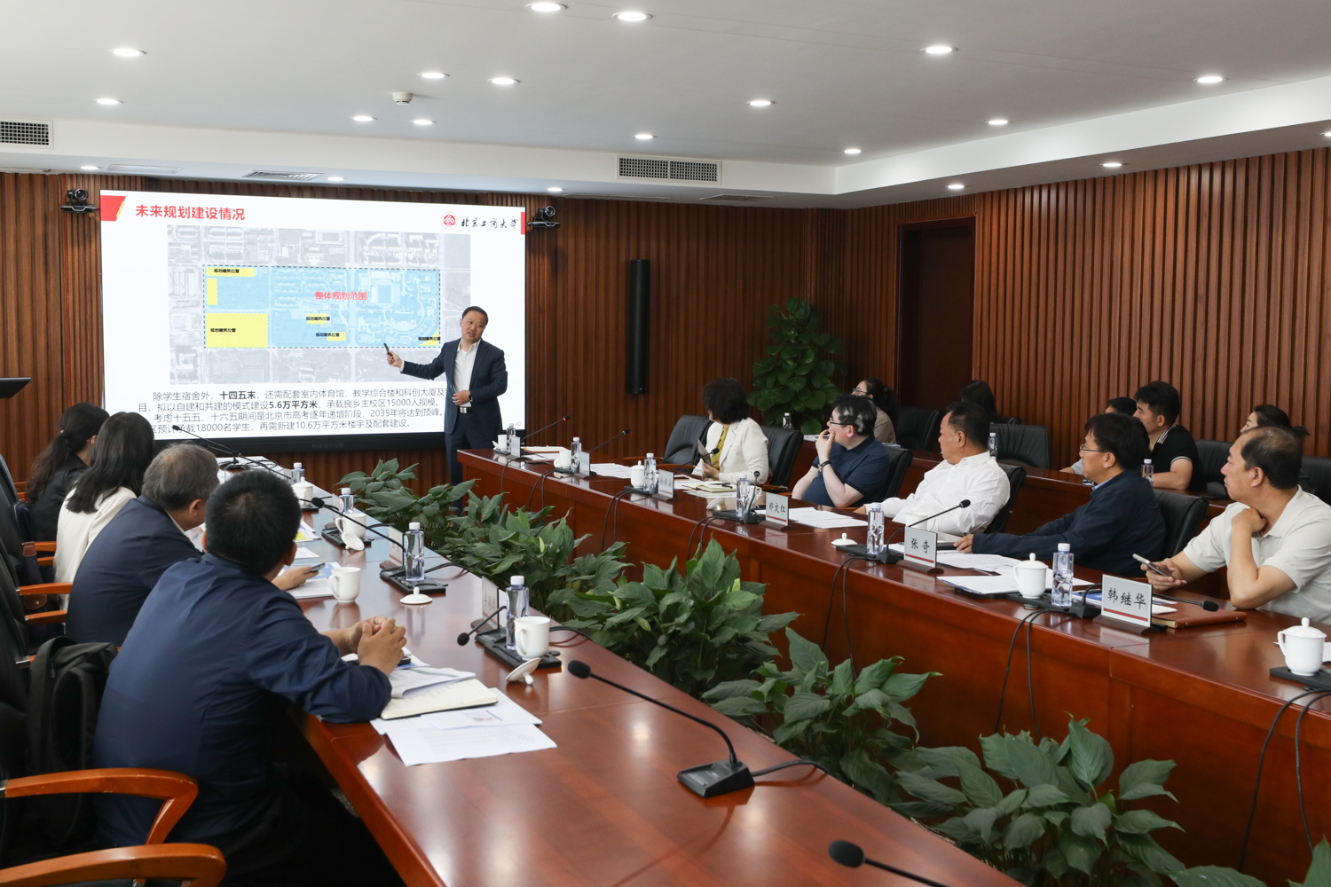 王方首先对学校作为第一所入驻良乡大学城的高校、积极承担首都疏解工作予以充分肯定。他表示,市教委全力支持北京工商大学良乡主校区基本建设工作,要求良乡大学城管委会、国网北京房山供电公司、市规自委房山分局等部门,积极协助解决北京工商大学在推动良乡主校区相关建设工作中遇到的供电、规划指标核定等难题;北工商要抢抓政策机遇,主动作为,与房山区融合发展,高质量做好校区规划建设,努力提升学校办学环境。