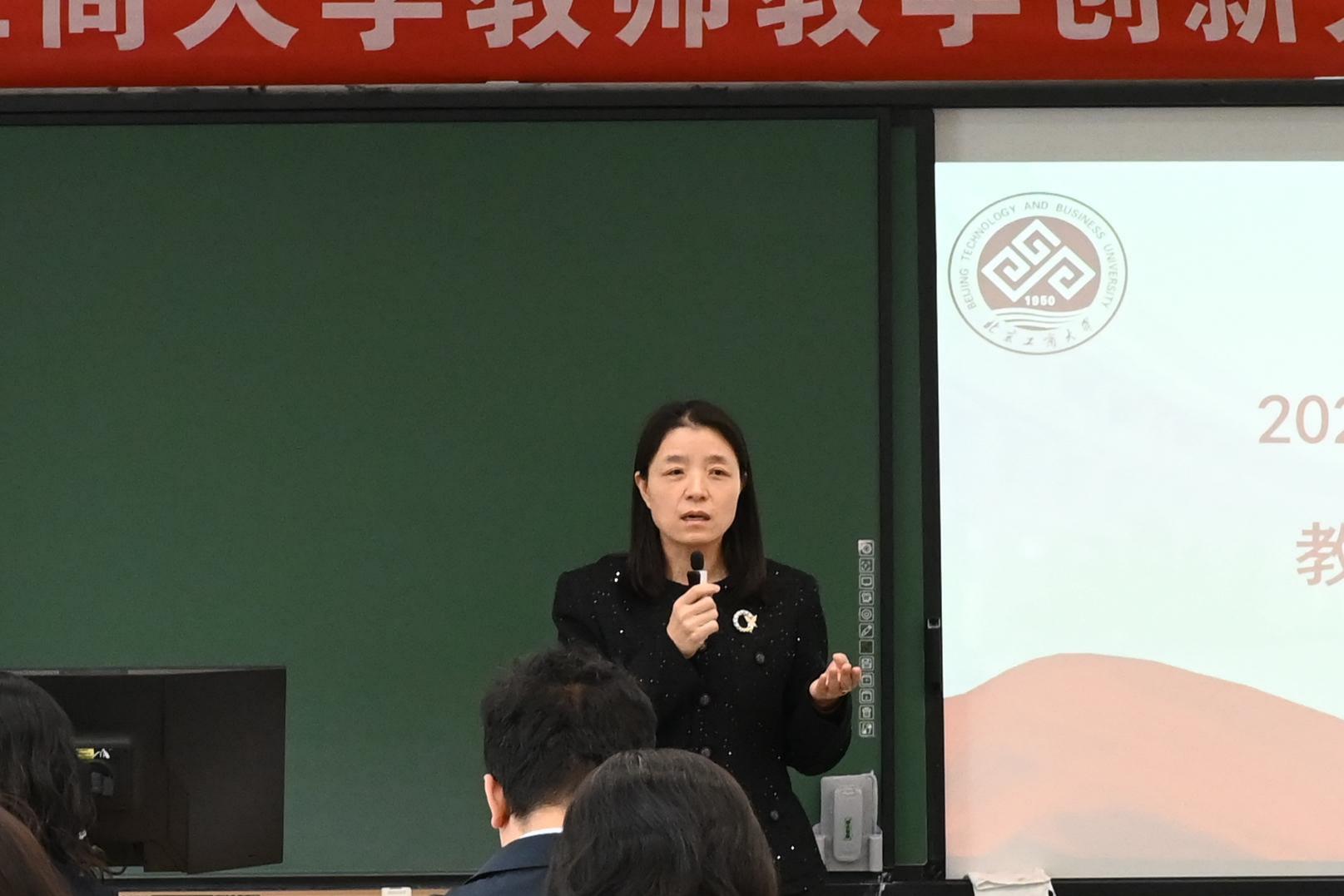刘艳楠在致辞中指出,当前我国正加速推进教育强国建设,高等教育正式迈入高质量发展新阶段。提升教师教书育人核心能力,锻造一支高素质、专业化、创新型的教师队伍,既是高校落实立德树人根本任务的核心抓手,更是北京工商大学办好人民满意的高等教育、建设特色鲜明高水平研究型大学的必由之路。围绕学校发展定位与教学创新工作,她向全校教师提出四点明确要求:一是彰显办学特色,锚定育人方向。教学创新需紧扣学校“工商一体化”核心办学特色,立足学科优势,将办学特色深度融入教学全过程,依托“双一流”学科创建,让教学创新贴合学校发展定位,充分彰显北工商育人特色。二是强化数智赋能,创新教学模式。突出人工智能在教育教学中的赋能作用,推动人工智能与课堂教学深度融合,鼓励教师运用智能技术创新教学方法,打破传统教学边界,提升教学的趣味性与实效性。三是注重团队建设,凝聚育人合力。高度重视教师团队建设,以大赛为纽带促进教师间交流协作,传承优良教学经验,打造高素质专业化教师队伍,凝聚起教学创新与育人工作的强大合力。四是深化教学改革,提升培养质量。以本次大赛为重要抓手,持续深化本科教育教学改革,严格落实 “以本为本”、扎实推进 “四个回归”,把大赛成果有效转化为教学改革内生动力,持续提升人才培养质量,为学校高质量发展注入强劲动能。