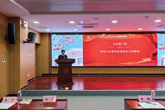 公共事务处党总支书记文四英代表上一届公共事务处党总支委员会作题为《实事求是谋发展,全心全意促提升,努力开创公共事务处工作新局面》的工作报告。报告从旗帜鲜明讲政治、理论武装得到强化、牢固树立服务理念、贯彻落实主题教育、推进“三全育人”工作、全力抓好学校巡察整改反馈问题、推动文化建设等方面,对过去五年的工作进行了总结回顾,并提出了今后的工作目标和努力方向。