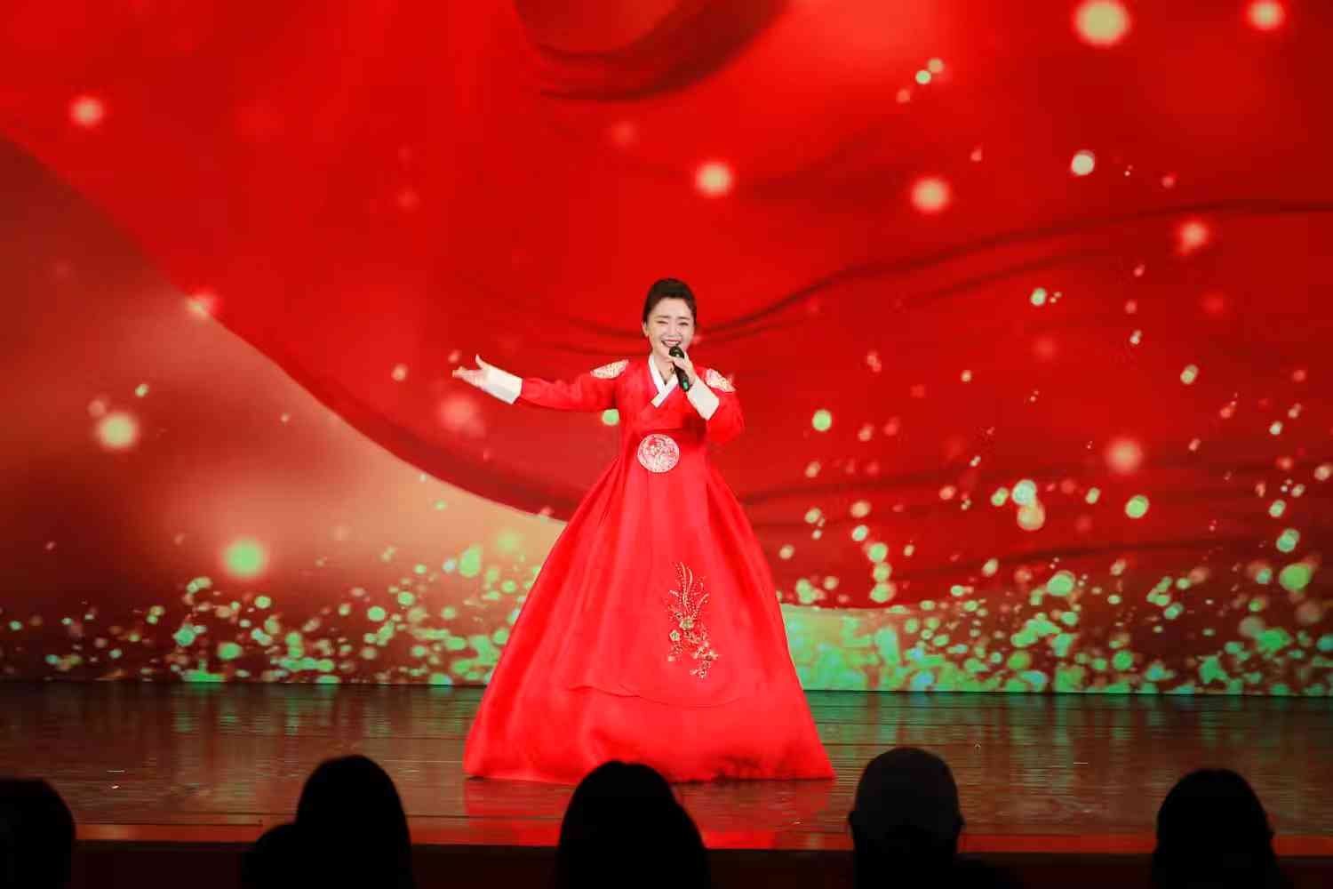 当经典旋律响起,全场共鸣。女声独唱《映山红》《红太阳照边疆》将经典红歌与民族歌曲巧妙结合。歌唱家卞英花醇厚的嗓音饱含深情、激昂嘹亮,唱出了峥嵘岁月里的红色信仰,唤起了现场师生强烈的家国情怀与民族自豪感。