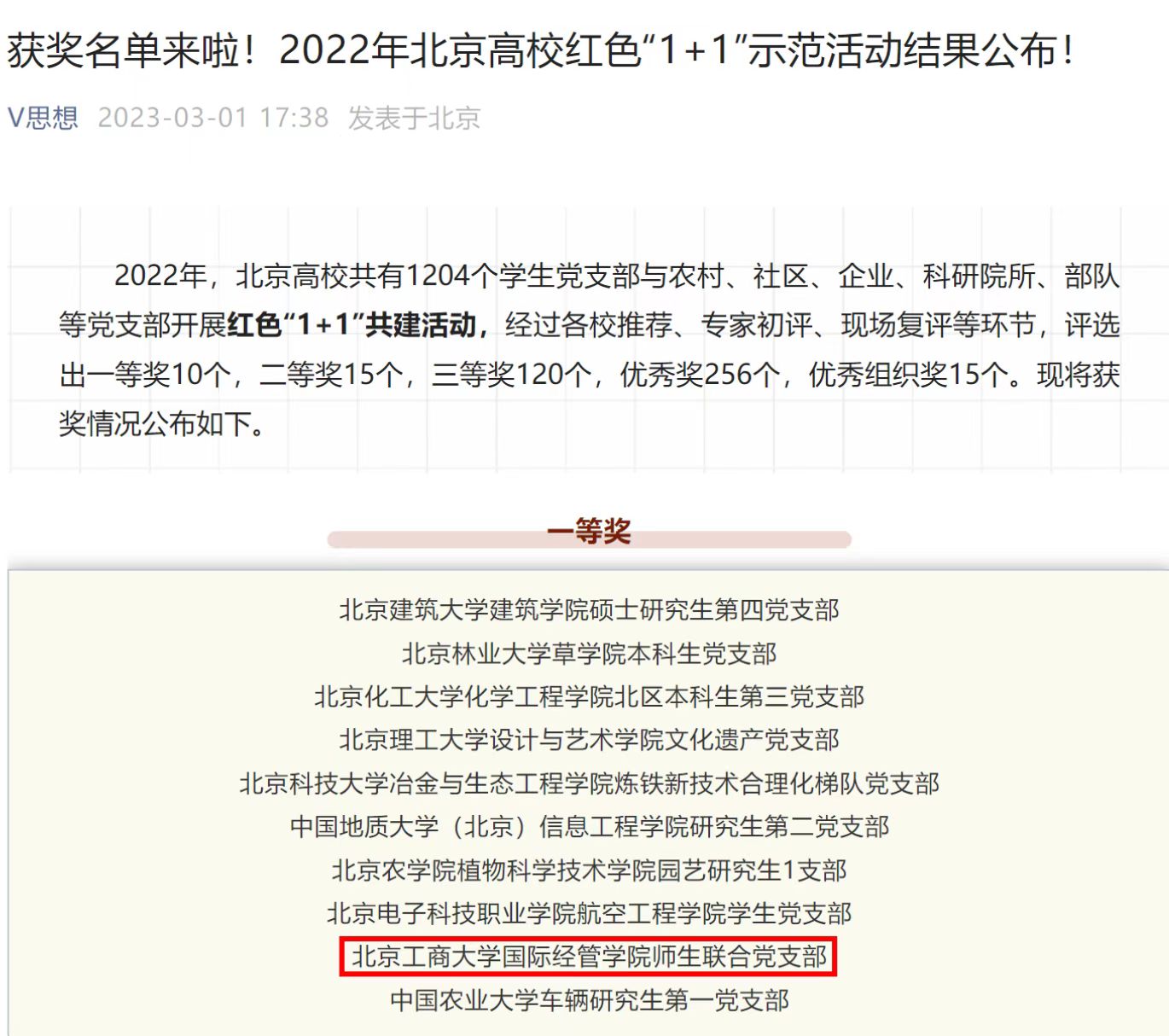 近日,北京市委教育工委公布了2022年北京高校红色“1+1”示范活动评比结果,北京高校共有1204个学生党支部与农村、社区、企业、科研院所、部队等党支部开展红色“1+1”共建活动,经过各校推荐、专家初评、现场复评等环节,我校5支党支部获得市级奖励。国际经管学院师生联合党支部从北京高校1204个党支部中脱颖而出,斩获一等奖,经济学院金融本科生党支部荣获三等奖,生态环境学院研究生专硕党支部、商学院人力营销本科生党支部、轻工科学技术学院生物工程本科生党支部获得优秀奖。