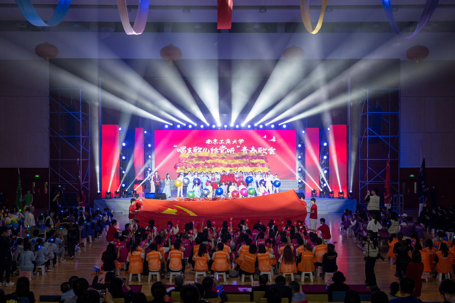 一段熟悉的旋律《唱支山歌给党听》开启了整场歌会,伴随着青春靓丽的开场舞《我和2035有个约》,18名学生舞动团旗、校旗、院旗进入会场,6名北工商青年传递一面10米宽的巨幅党旗,汇成一片红色的海洋。会场内歌舞交融、彩旗飘扬,现场观众随着节奏跟着一起挥舞,在热烈的掌声和欢呼声中青春歌会随之拉开序幕。此次活动是学校团委“学党史、强信念、跟党走”主题教育活动之一,以“唱起来”为开展形式,让师生在歌声中回顾红色历史、传承红色精神,向中国共产党成立100周年献礼。