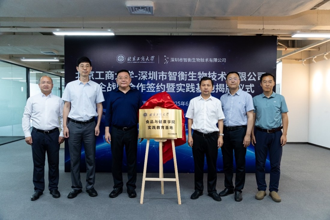 6月27日,党委常委、副校长寇红江带队赴深圳市光明区,出席北京工商大学-深圳市智衡生物技术有限公司校企战略合作签约暨实践基地揭牌仪式。深圳市光明区科技创新局副局长庄园、深圳市药品检验研究院副院长刘文亮、深圳市医疗器械检测中心总工程师刘尧,深圳市智衡生物技术有限公司总经理刘卫东,北京工商大学食品与健康学院院长王彦波、食品风味与健康交叉创新研究院常务副院长刘野等,共同见证合作签约与基地揭牌。