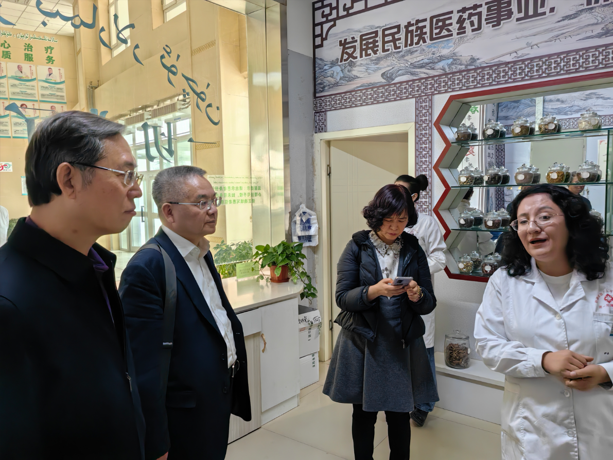 3月22日,调研组来到新疆维吾尔医学专科学校,参观了和田特色中医药重点实验室、新疆维吾尔医学专科学校第一附属医院。就非遗项目维药炮制技术、和田道地药材等进行了详细调研。在座谈会环节,调研组与现场教师进行了深入交流,了解了和田特色植物资源基本情况,并对化妆品学科的发展现状、人才培养等方面进行探讨。新疆维吾尔医学专科学校副校长汪洪涛,科研处副处长乃比江·麦图荪出席座谈会。