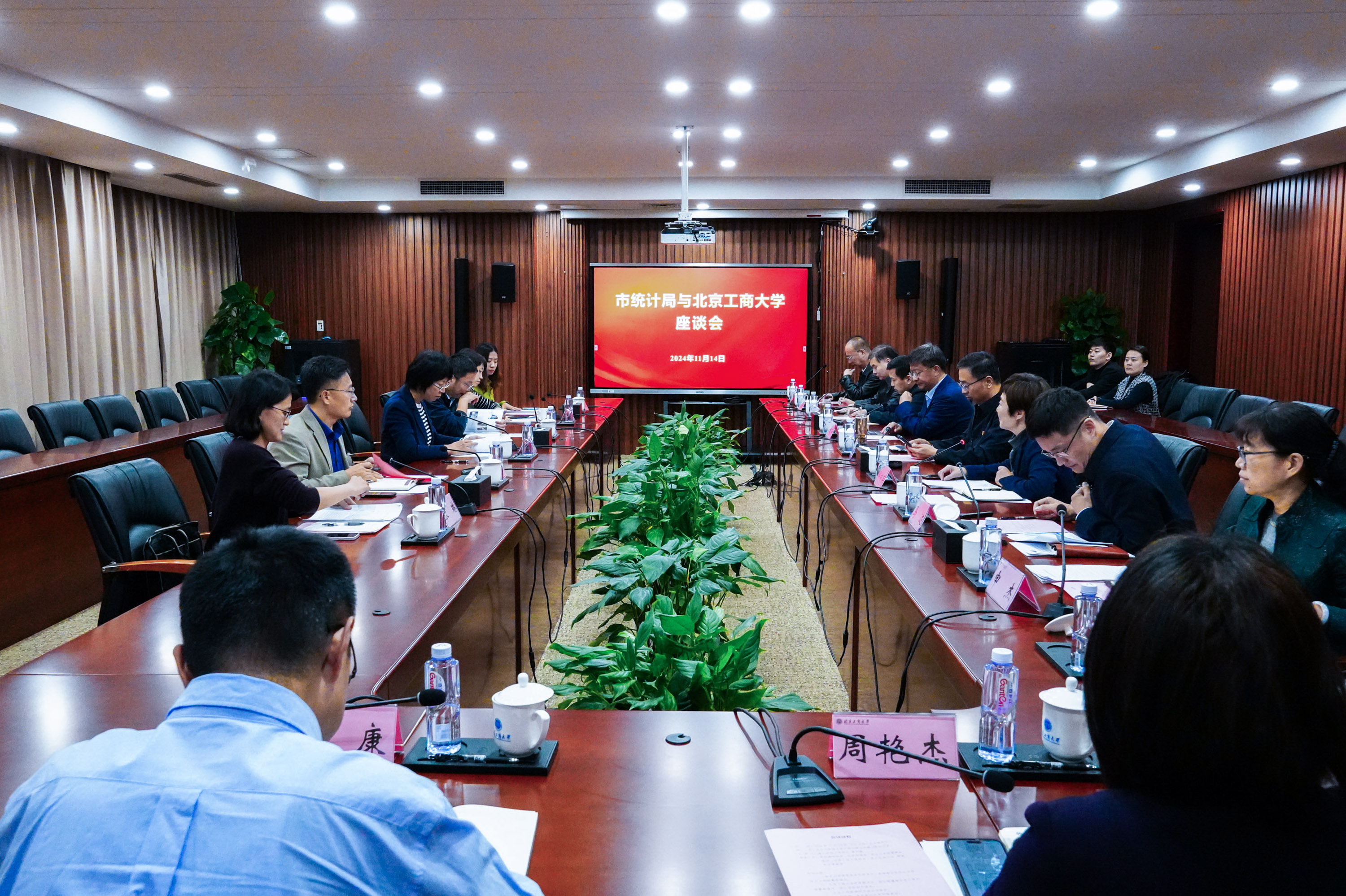北京市统计局数据应用处处长赖伟臣、人口处处长张琳、科技处处长安慧、人教处处长刘军、办公室三级主任科员王丽颖;房山区经济社会调查队队长申杰;学校科学研究院自然科学处处长钱立军、国内交流与合作处处长张晓磊、数学与统计学院党委书周艳杰、数学与统计学院副院长王康等参加调研座谈。