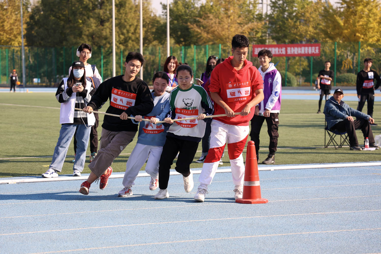 开幕式结束后,运动员、裁判员、志愿者以及看台上的观众们准备就绪,比赛陆续开始。运动员们全神贯注、斗志昂扬,在赛场上挥洒汗水,展现运动的魅力。观众席上彩旗招展、标语飞扬,加油声、呐喊声与鼓声此起彼伏,点燃了运动员们的激情,将赛场的气氛推向高潮。一幅幅激昂青春、拼搏奋斗的画卷正在绘就。跑道上的运动员们身姿矫健、健步如飞,跳高赛场上的运动员们身轻如燕、一跃而过,拔河比赛中的运动员们精神抖擞、齐心协力……食品与健康学院食品213班詹逸士在男子八百米小组赛中荣获第一,他表示,比赛虽然很累但却收获颇丰,运动让他结识了志同道合的朋友,学习到其他运动员的长处。商学院志愿者邢雪萍参与了主席台、护栏的搭建和物资的搬运,她表示志愿工作虽然辛苦,但同时从中也享受到帮助他人带来的成就感。