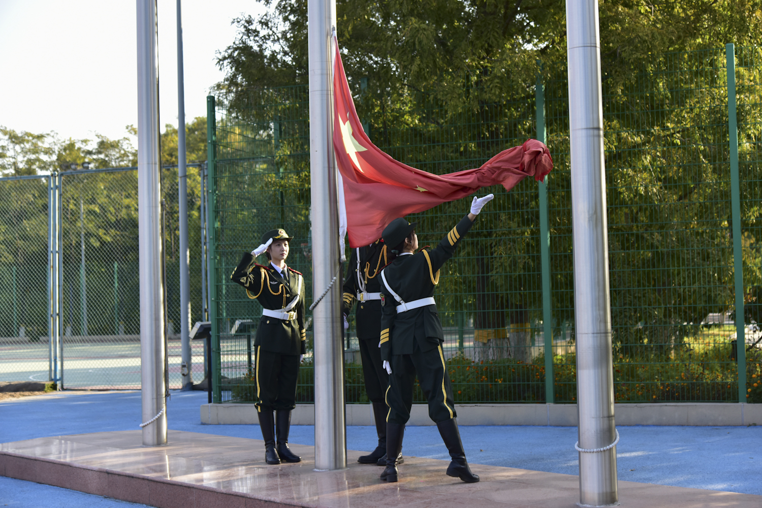 在庄严的国歌声中,五星红旗冉冉升起,运动会开幕式拉开帷幕。