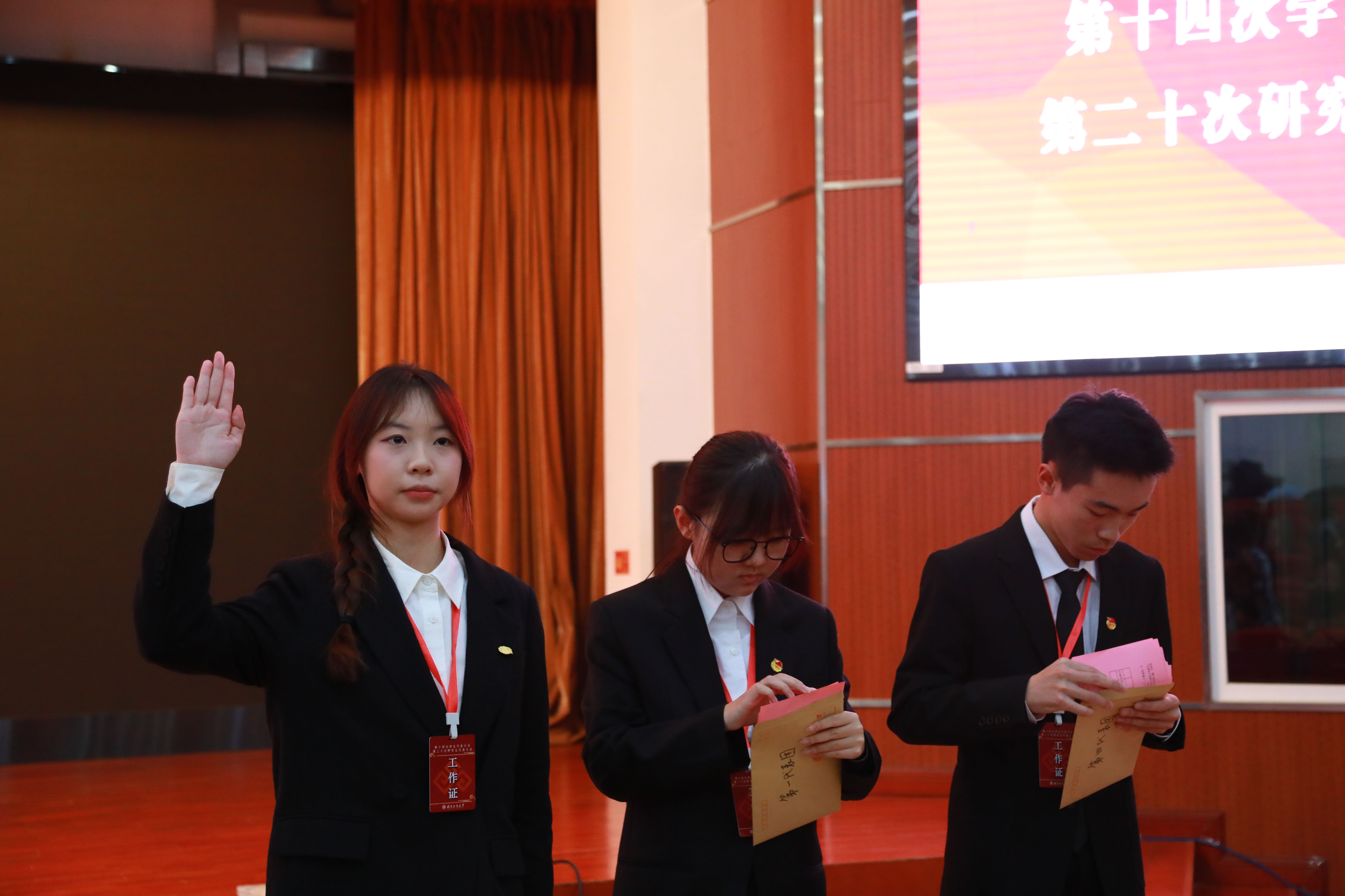 校学生会执行主席耿焱峰作学生会工作报告,他从筑牢理想信念、完善规章制度、优化组织建设、营造学习氛围、繁荣校园文化、维护学生权益、加强新媒体建设等方面,全面系统地回顾了第十三届学生会工作。未来,学生会组织将团结带领广大青年学生立大志、明大德、成大才、担大任,助力学校事业高质量发展,谱写新时代青春之歌。校研究生会执行主席高新然作研究生会工作报告,她总结了过去一年研究生会从研究生的需求和群体特色出发,经过不断创新,在党建引领、导学关系、组织建设、文化氛围和宣传阵地五项工作的特色和亮点,尤其是首届“四优”导学团队的评选,获得了新华网等媒体的超过600万的阅读量。她表示,研究生会将继续坚持“全心全意为师生服务”的宗旨,踏上新的征程,创造新的佳绩。