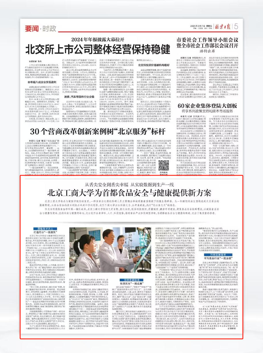 3月7日,《北京日报》第五版要闻·时政版以《从舌尖安全到舌尖幸福 从实验数据到生产一线,北京工商大学为首都食品安全与健康提供新方案》为题,报道了我校食品与健康学院聚焦食品安全战略需求,以赋能食品安全与健康为使命,坚持风味与健康双导向,为首都食品安全与健康提供新方案。